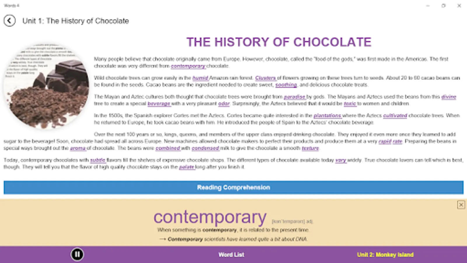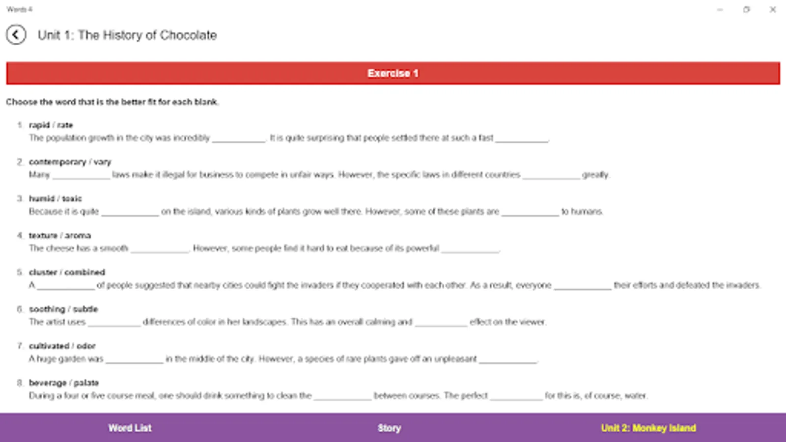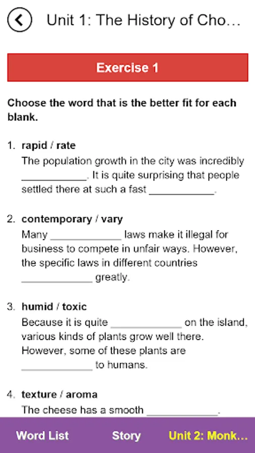 The activities in "4000 Essential English Words" are specially designed to make use of important learning conditions. Firstly, the words are introduced using sentence definitions and an example sentence. The activities that follow in the units encourage learners to recall the meanings and forms of the words. Some activities also make the learners think about the meaning of the words in the context of a sentence—a sentence different from the sentences that occurred in the introduction of the words. Moreover, each unit ends with a story containing the target words. While reading the story, the learners have to recall the meanings of the words and suit them to the context of the story. Such activities help learners develop a better understanding of a common meaning for a given word which fits the different uses.
