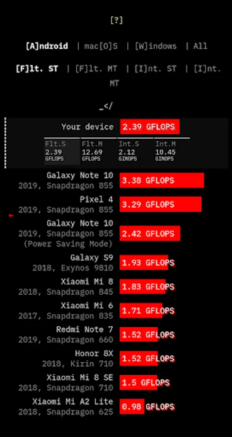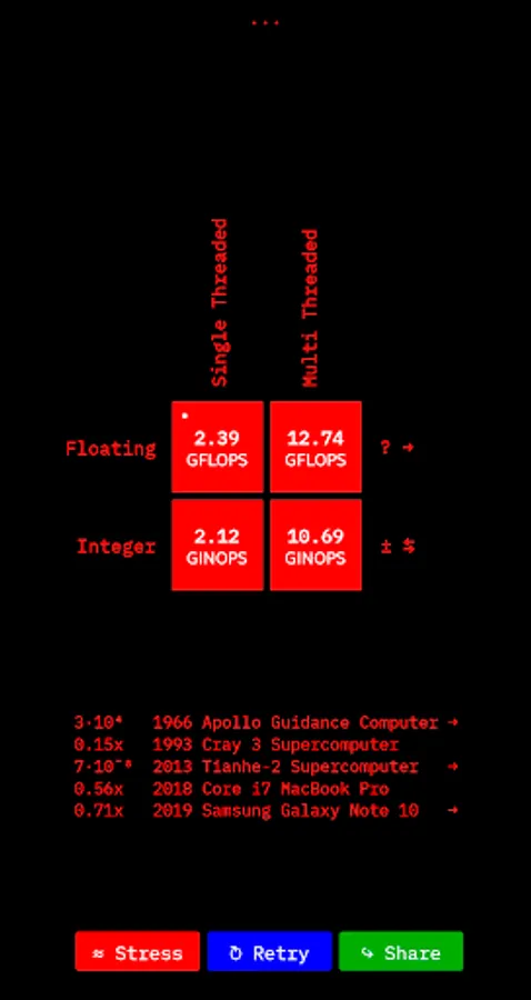 You can compare your device's performance to 1960s Apollo Guidance Computer or 1990s super computer. There's also a results database with comparison figures for more actual devices (smartphones, laptops).