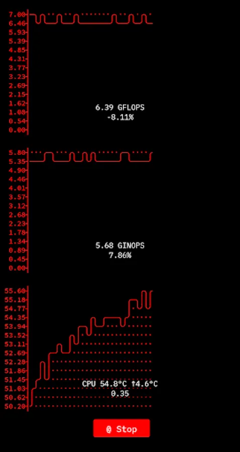 The app calculates how many operations (add, subtract, multiply, divide, etc.) a CPU can perform in a given second with either fractional (floating-point) or integer numbers.