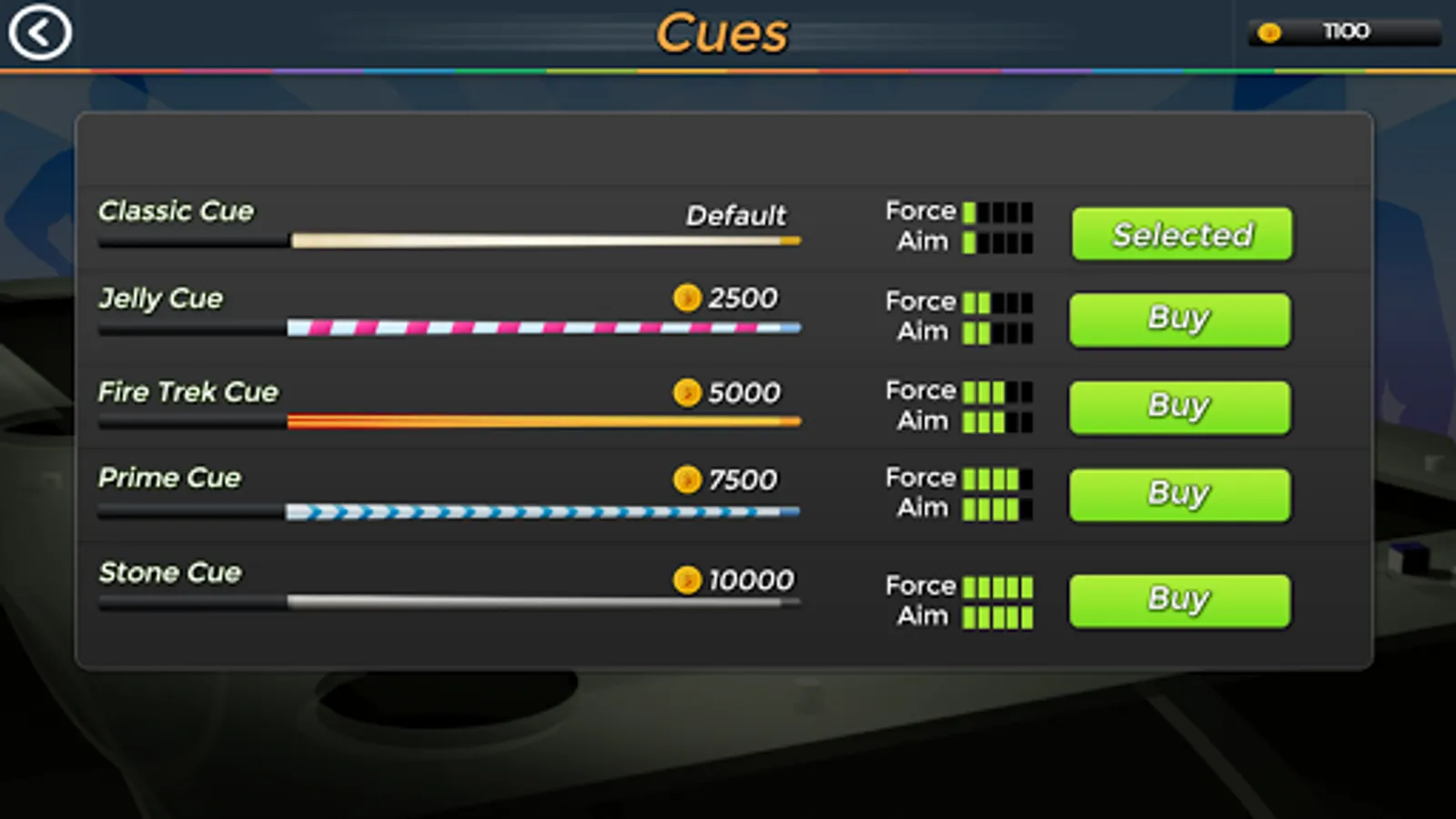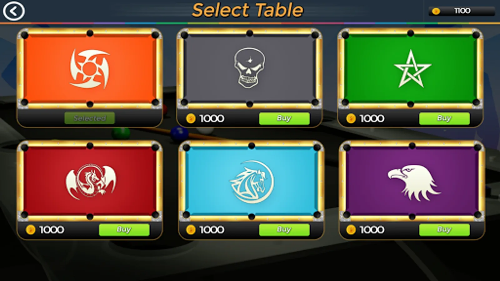 You can buy many stuff in the game shop. You can upgrade your cue color & also you can upgrade its aim accuracy and power of shot. You can change table color of your choice & also choose logo of your taste. You can buy additional chat packs to communicate with your friend or other game play.