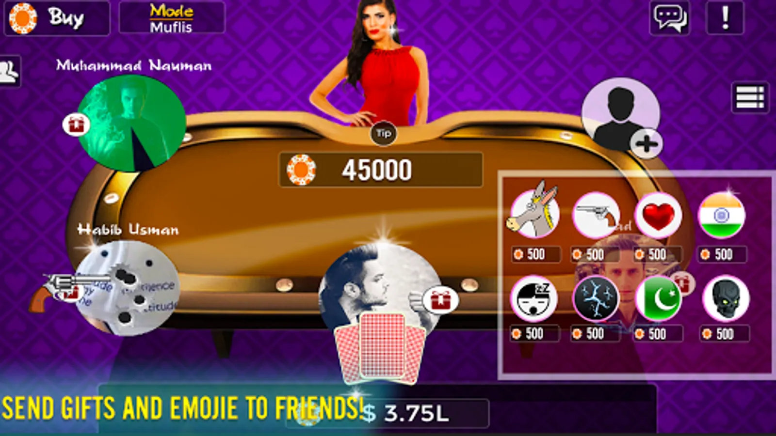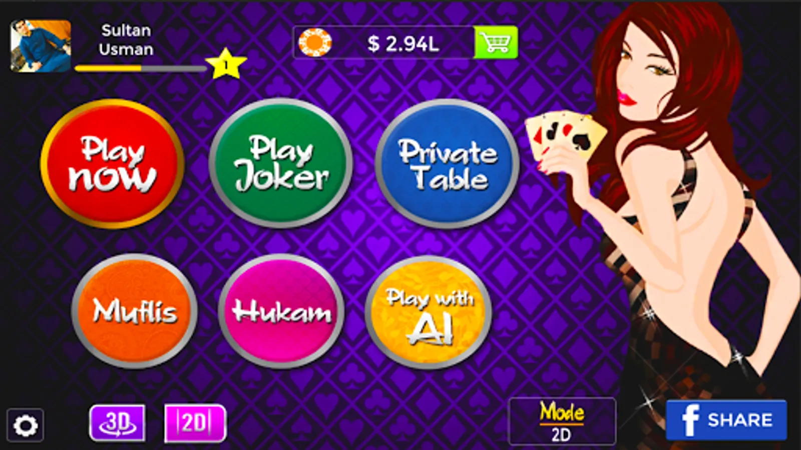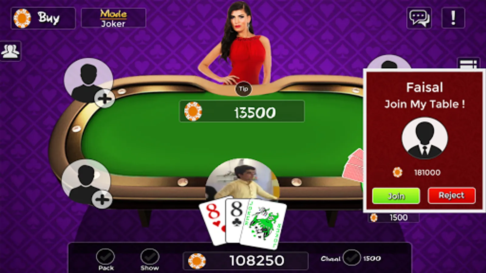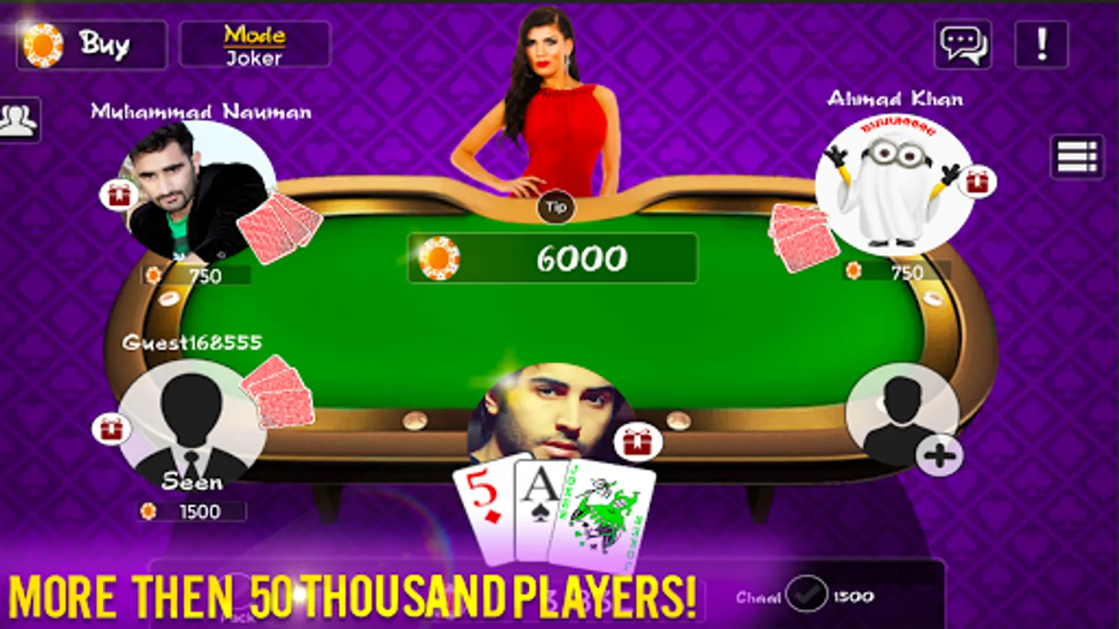 Teen patti multiplayer's variants are Joker, Hukam, Muflis, AI and private tables.