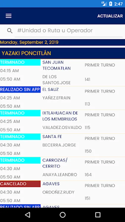 • List of services scheduled on the day