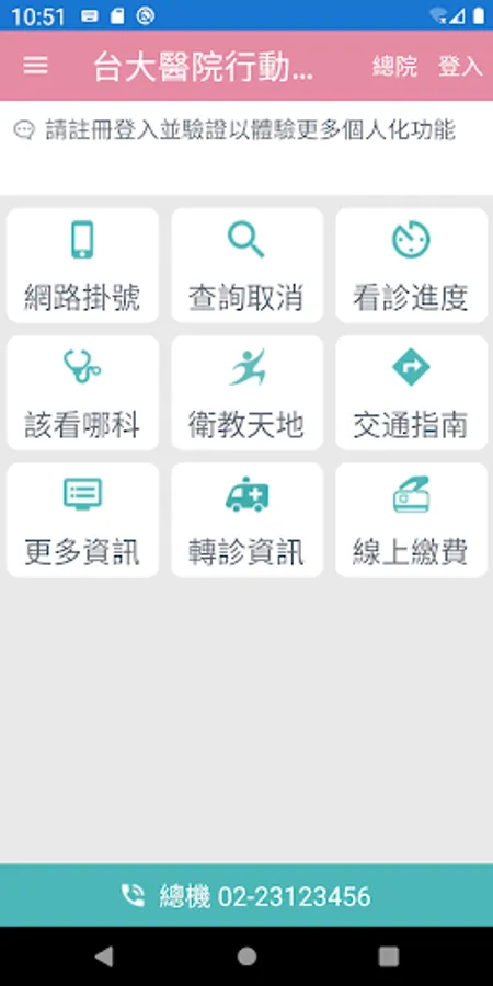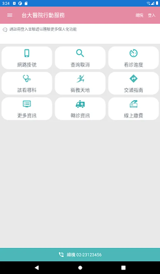 The mobile service APP of National Taiwan University Hospital provides medical service information of National Taiwan University Hospital General Hospital, Beihu Branch, Jinshan Branch, Hsinchu Branch, Zhudong Branch, and Yunlin Branch. And provide the basic information of commonly used relatives and friends to file, which is convenient for registration related operations.