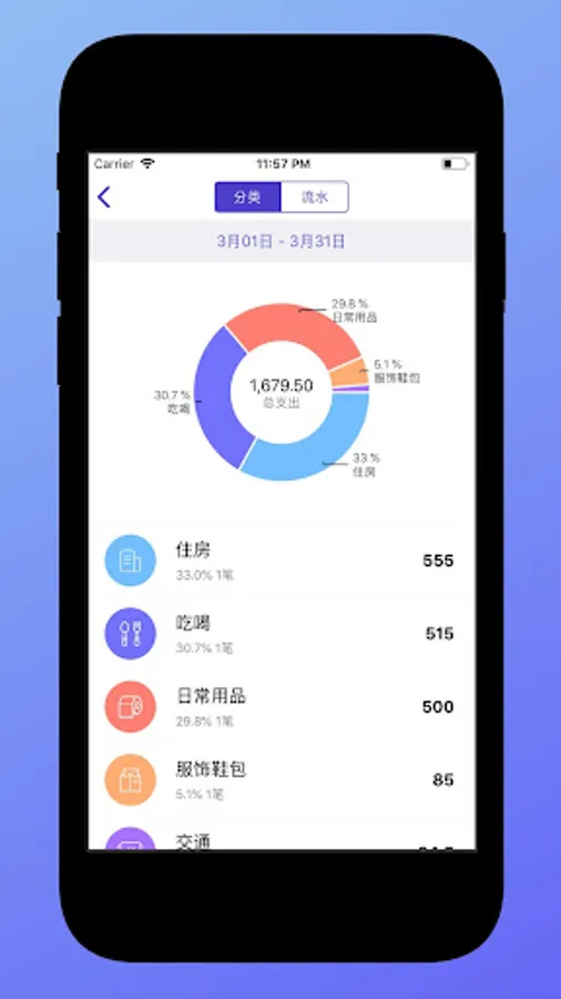 3. Analysis chart: classification pie chart, flow line chart to analyze and statistics the revenue and expenditure structure.