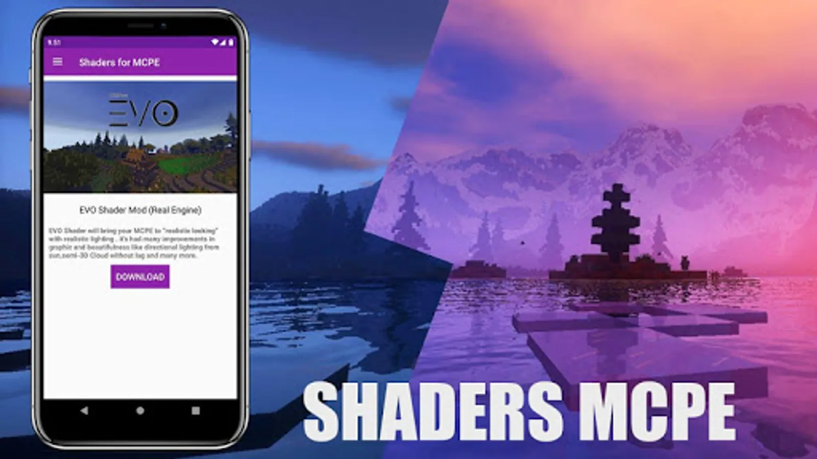 ✔️ EVO Shader Mod (Real Engine):EVO Shader will bring your MCPE to “realistic looking” with realistic lighting . it’s had many improvements in graphic and beautifulness like directional lighting from sun,semi-3D Cloud without lag and many more.