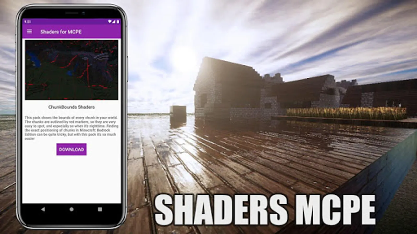 This is a Shader pack to use with Minecraft PE. All kinds of Shaders to change the look of Minecraft PE in your game. Include realistic shaders and raytracing mods.
