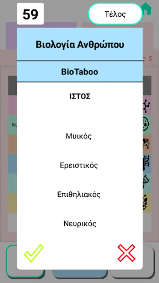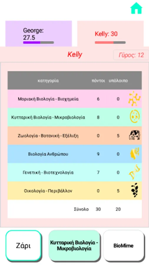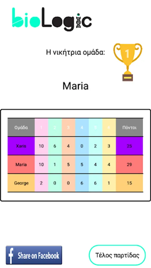 The game ends when a team reaches the totality of the points agreed from the beginning (from 10 to 100). At the same time, it should have accumulated points from all categories of Biology to at least 10% of the total points that have been set (eg if the teams are set to play at 70 points, it must in all its categories Biology have collected at least 7 points). Otherwise, they continue until they meet this treaty. Caution: if a team reaches the total of 10% of the points because it played first in the game, it must leave the other or the other teams to complete the same number of rounds to get the final result.