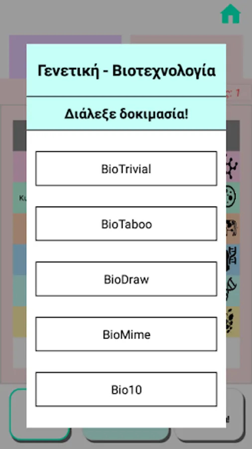 Each group has 60 seconds to compete in one of the 5 game tests related to Biology, divided into categories. The combination of game play - Biology category occurs randomly through the use of "electronic dice". Within the minute given each group is called to: