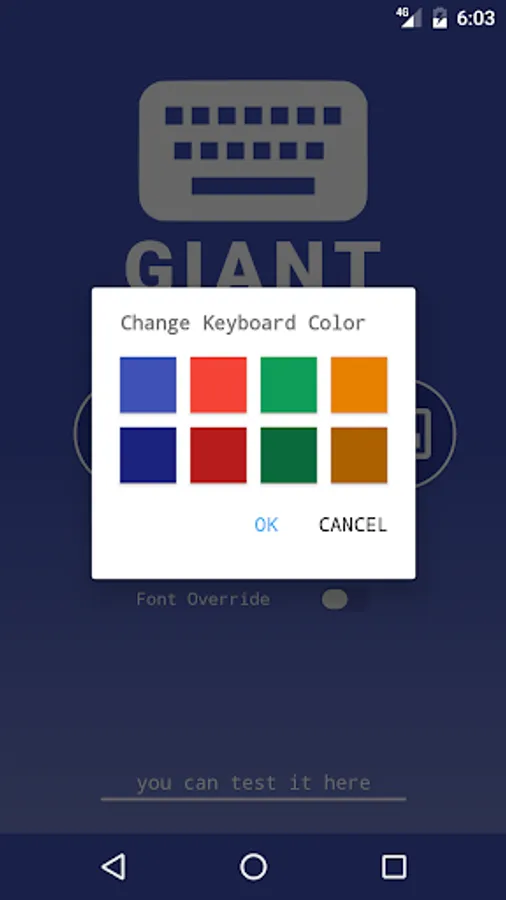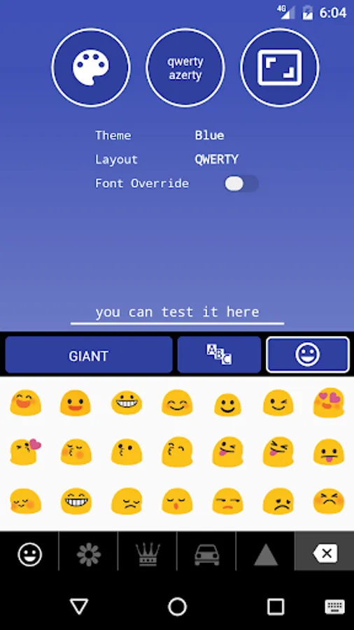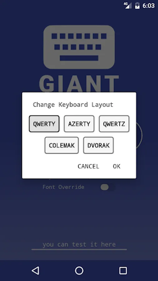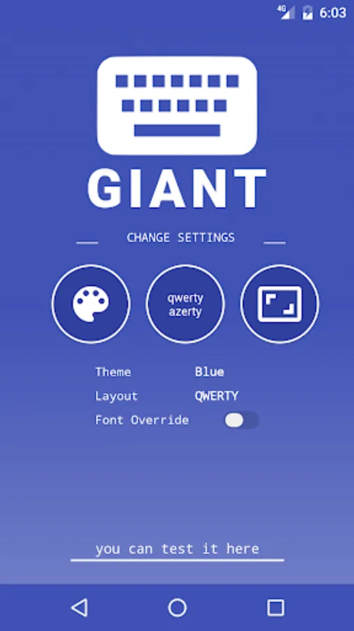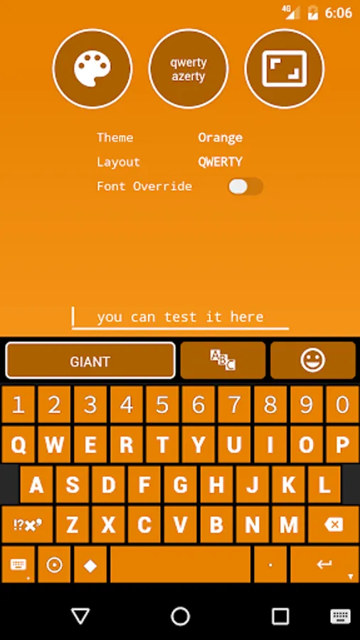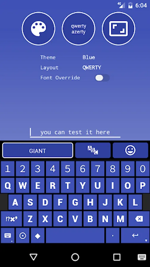 You can choose between 8 COLORS or set your own keyboard SIZE. Giant Text also supports different keyboard layouts: QWERTY, AZERTY, QWERTZ, DVORAK and Colemak.