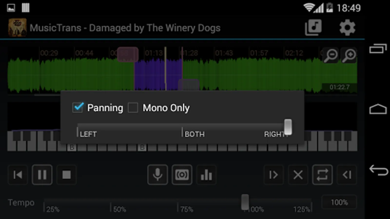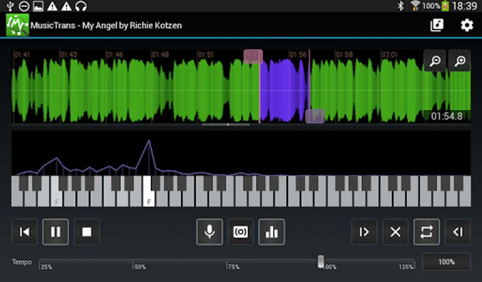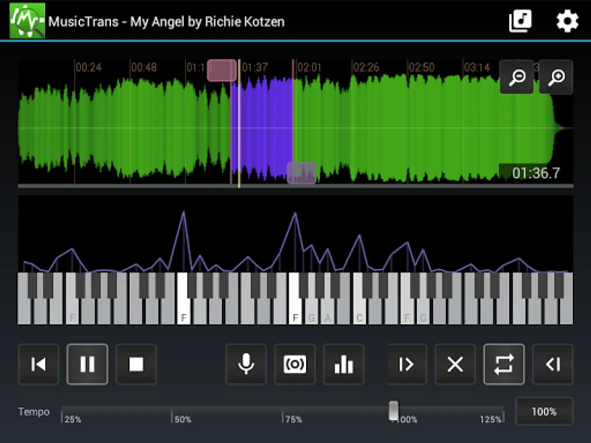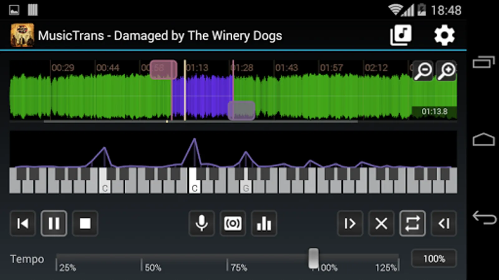 MusicTrans allows you to slow your music down to 25% of its speed without altering its pitch or original sound. You can also mark a section for loop, so you can practice your playing and repeat that section all the times that you need to, at your own pace.