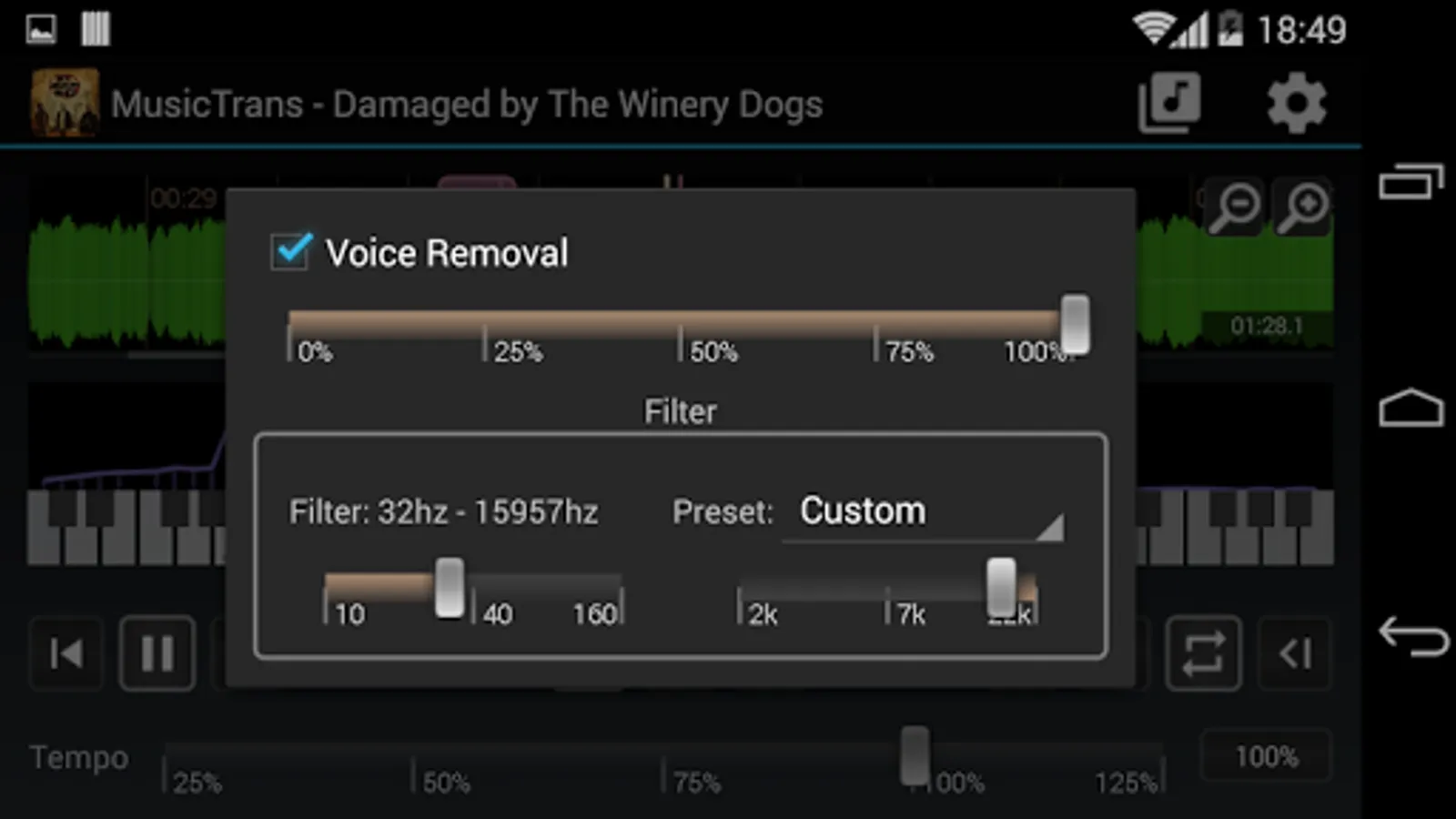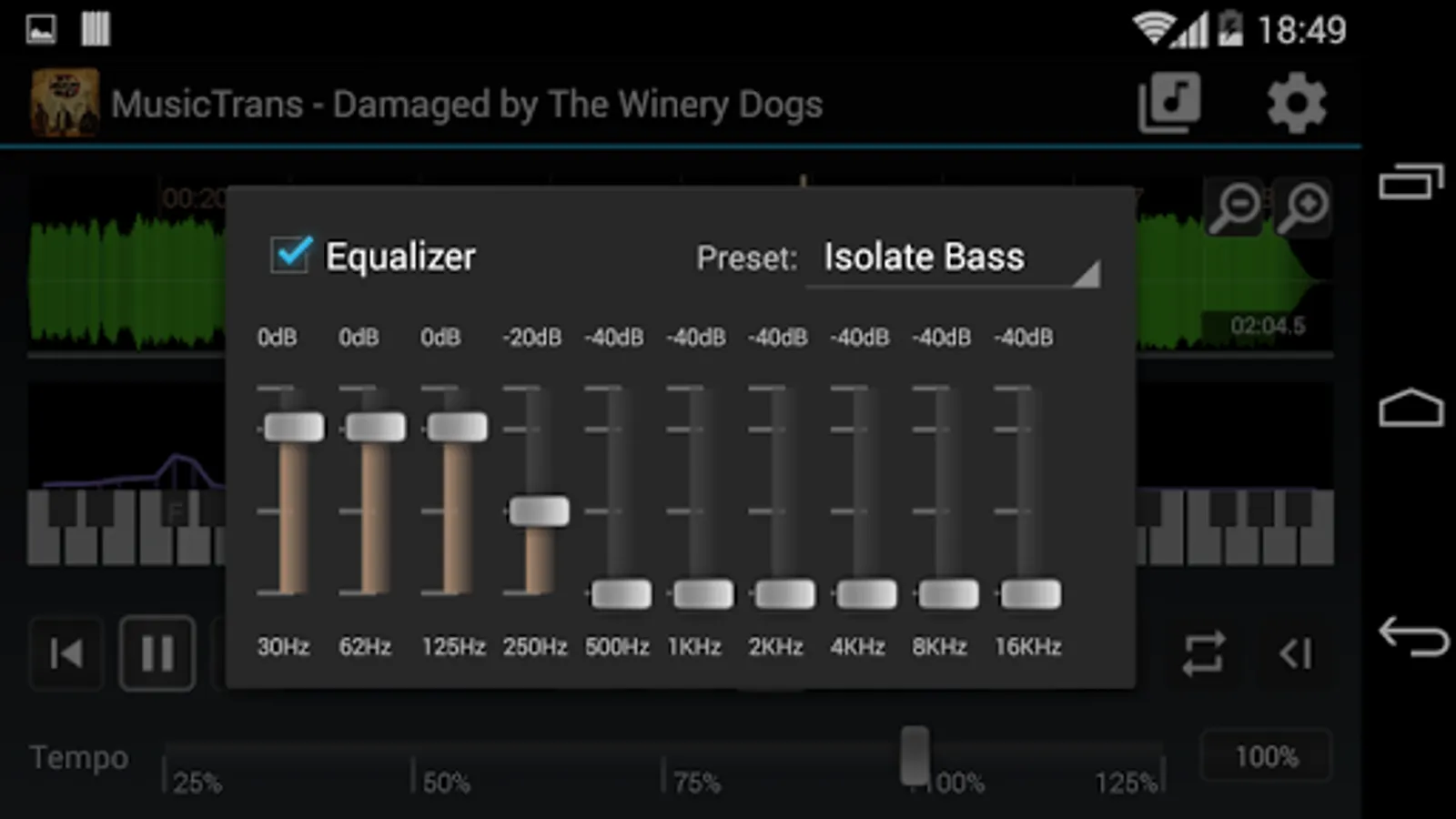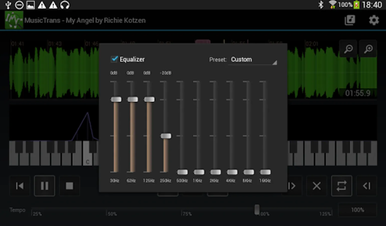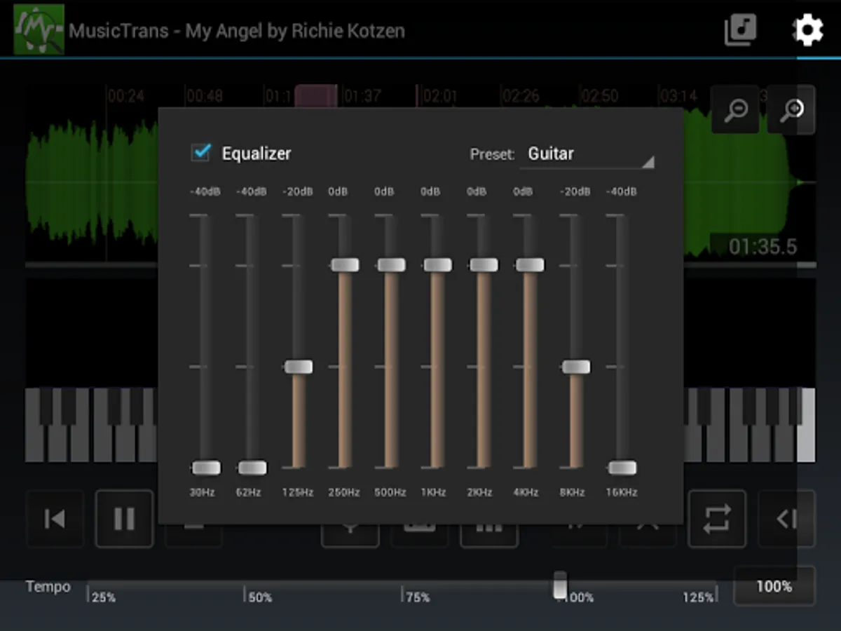 MusicTrans allows you to slow your music down to 25% of its speed without altering its pitch or original sound. You can also mark a section for loop, so you can practice your playing and repeat that section all the times that you need to, at your own pace.
