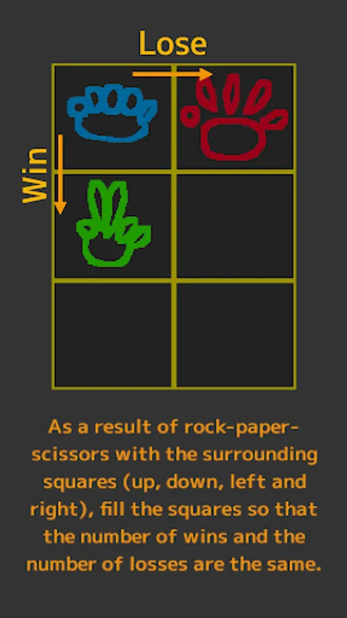 As a result of rock-paper-scissors with the surrounding squares (up, down, left and right), fill the squares so that the number of wins and the number of losses are the same.