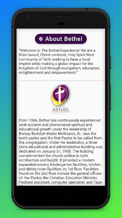 The Official Church Application for the Bethel Church. “Welcome to The Bethel Experience! We are a Bible-based, Christ-centered, Holy Spirit-filled community of faith seeking to have a local imprint while making a global impact for the Kingdom of God through evangelism, education, enlightenment, and empowerment.”
