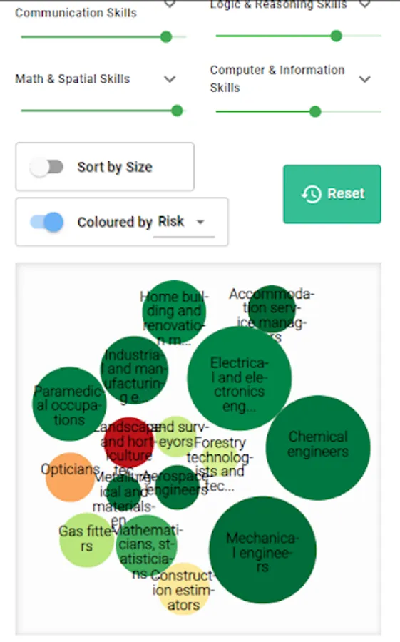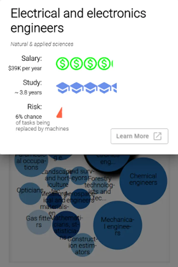 This career explorer app will help you learn more about what kinds of jobs are best suited to your preferences. Quickly filter jobs based on skill levels, salary, education, and risk of automation (tasks being replaced by machines). This app uses the National Occupation Codes dataset created by the Government of Canada.