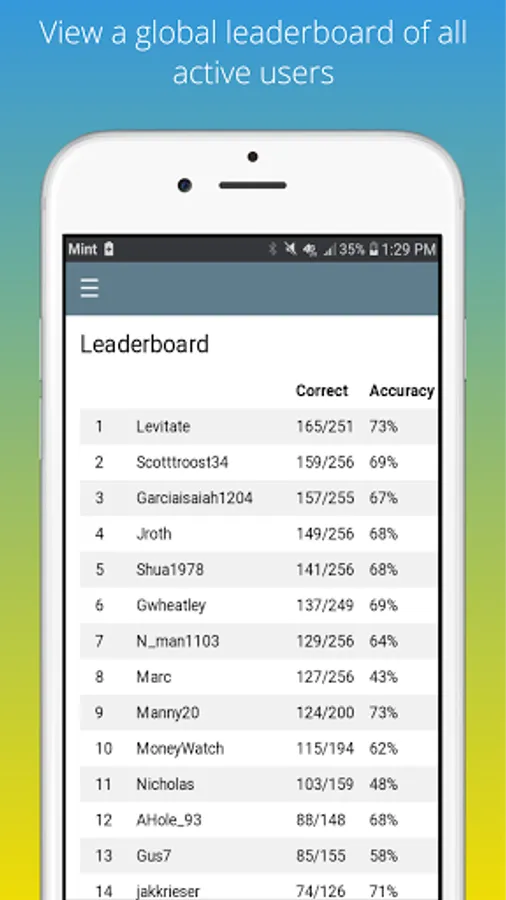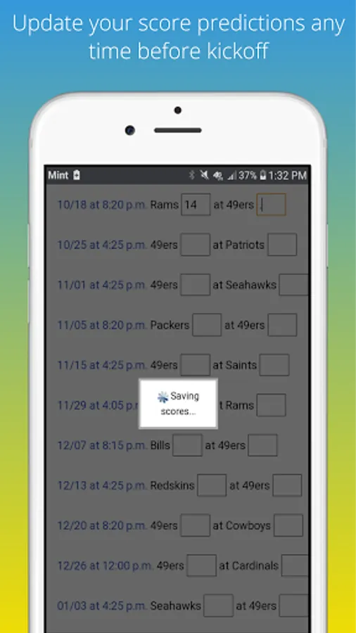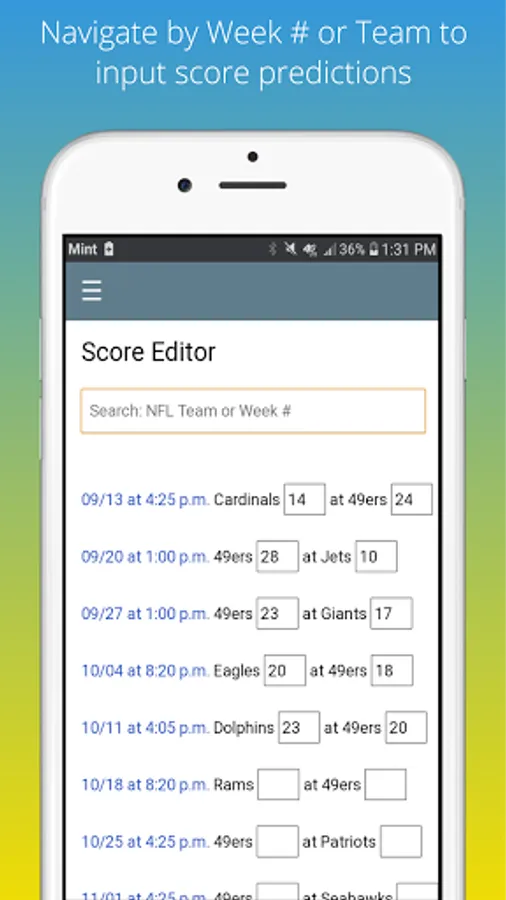 This app keeps track of your score predictions and compares them to the actual results of each game. Users with correct predictions are ranked on a Leaderboard.