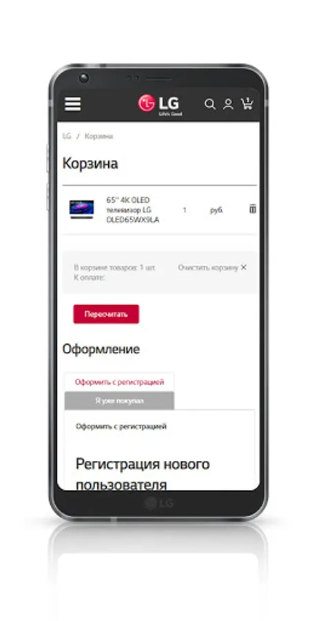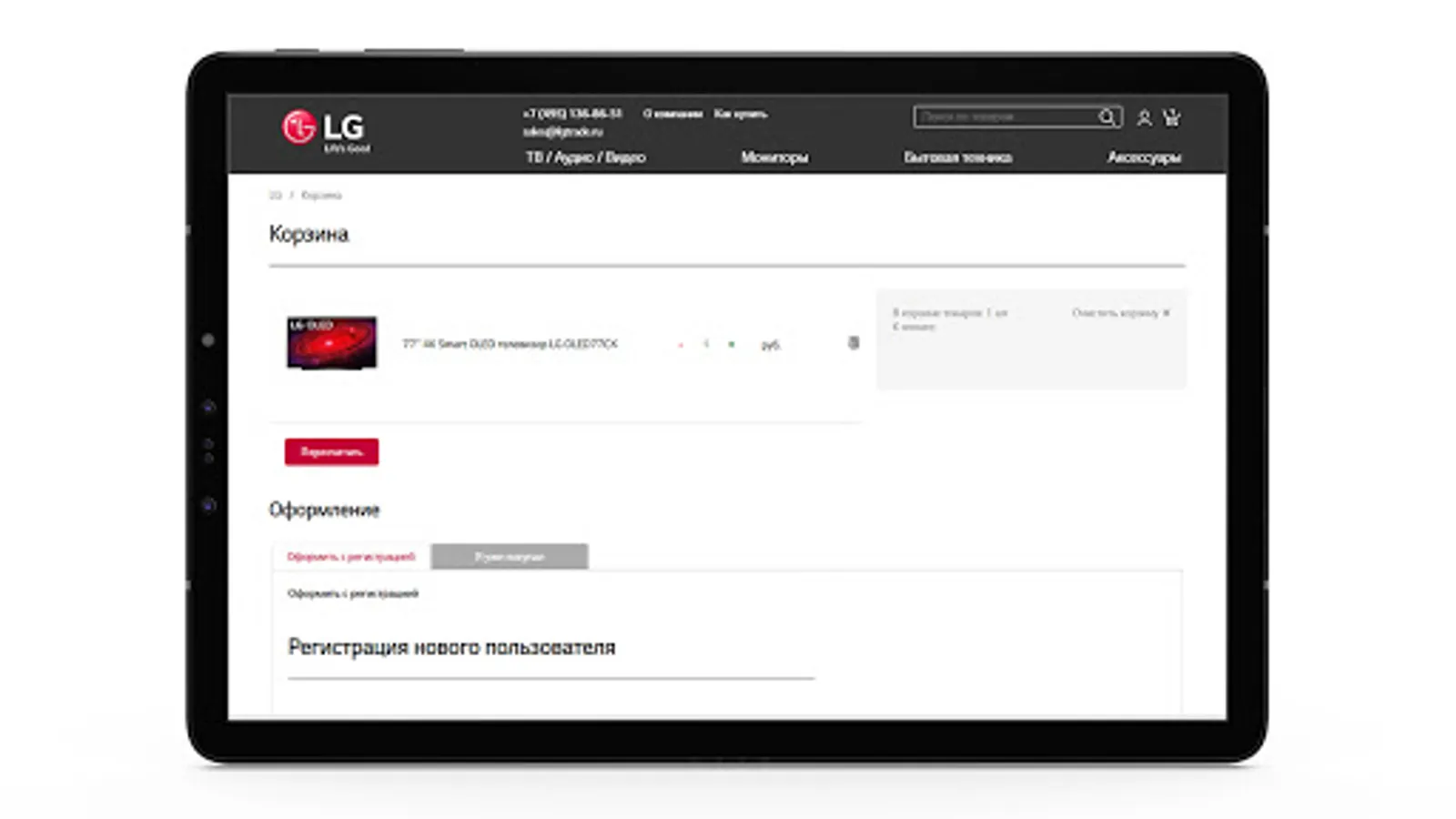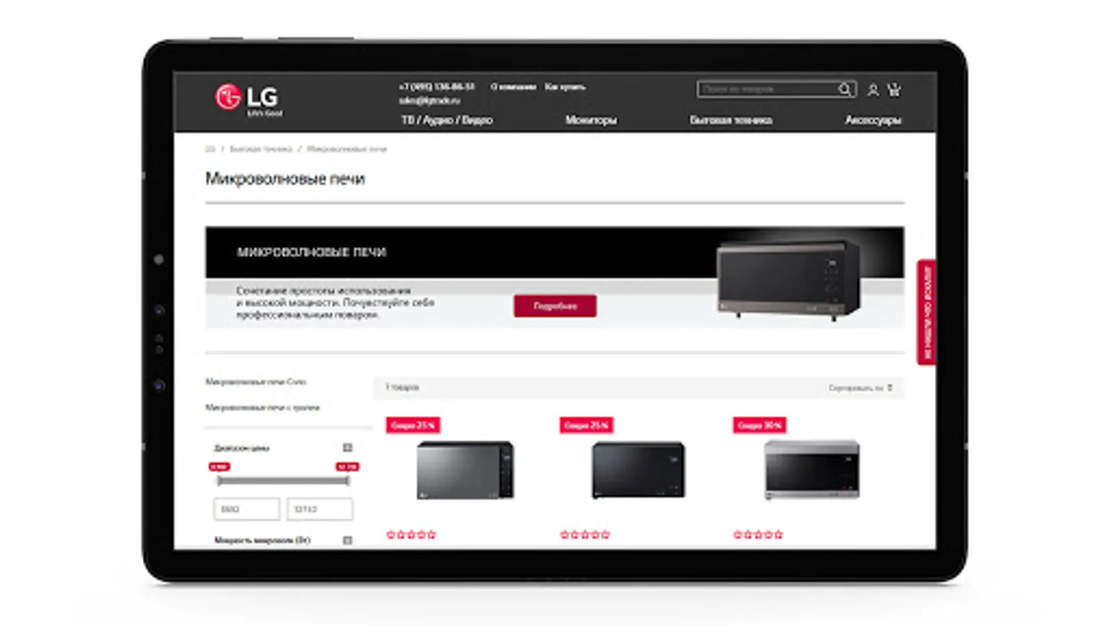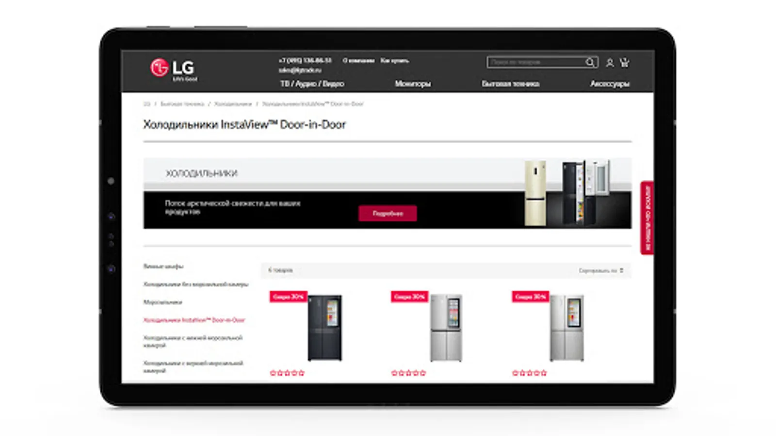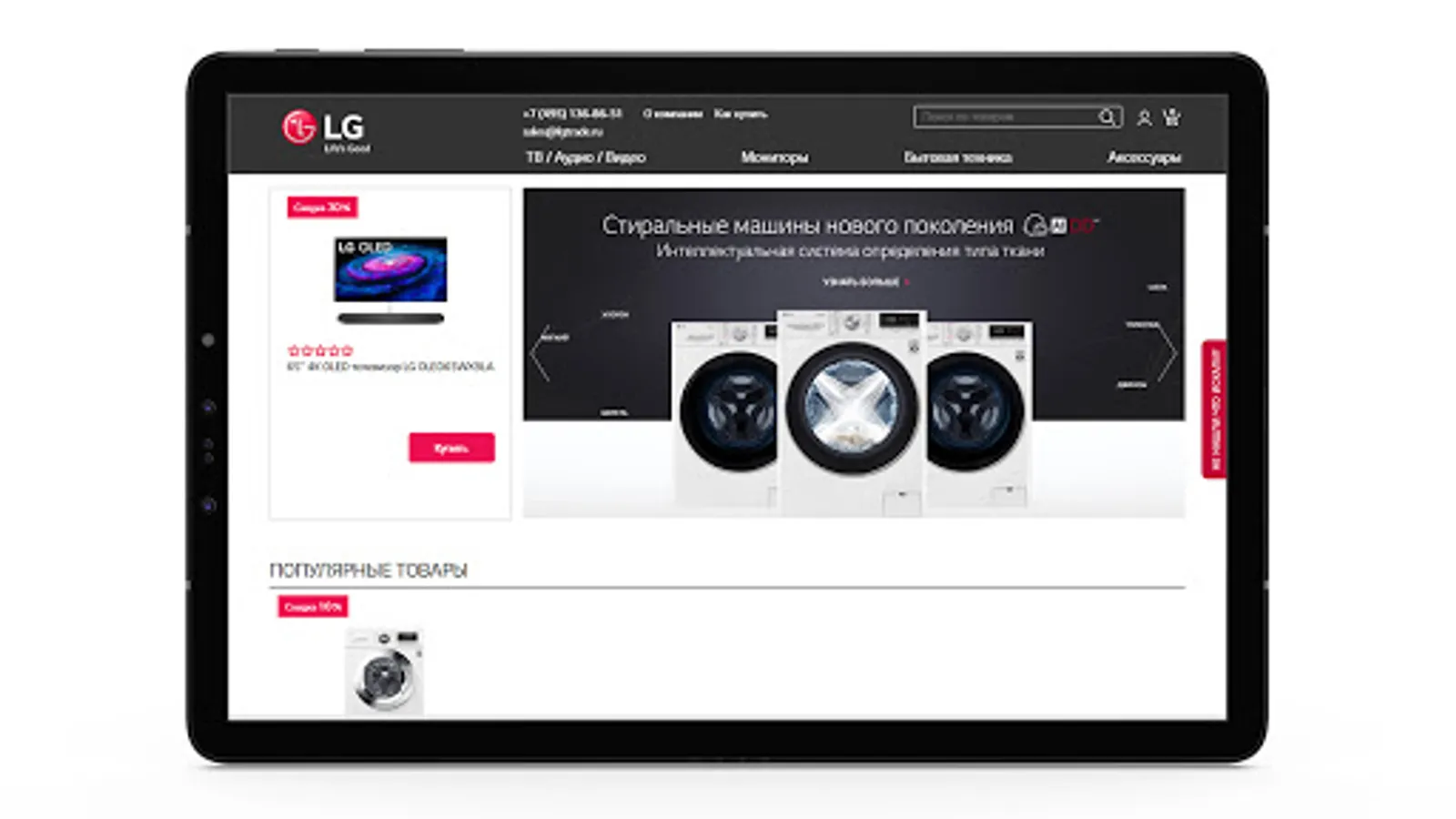 After logging into the store's landing page, the visitor gets access to a wide range of LG home appliances and electronics at attractive prices. Payment is made by credit card on the store's website, delivery is carried out in the Russian Federation by transport companies, delivery in Moscow and Moscow region is carried out by its own logistics service and transport companies. The calculation of the cost of delivery is carried out to the delivery address automatically before paying for the goods in the basket.