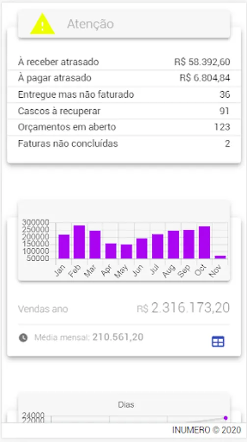 Business management system integrating the Sales, Services, Industry, Purchasing, Warehouses and Finance departments. With all the necessary resources for you to have your company under control. Dozens of reports and graphs of sales, product movement and finance. Issuance of NFe, NFSe, bank slips, printing of thermal labels and QRcode to monitor delivery by the customer. The FREE version is complete, it has the same modules as the paid versions. See also our website https://inumero.com.br
