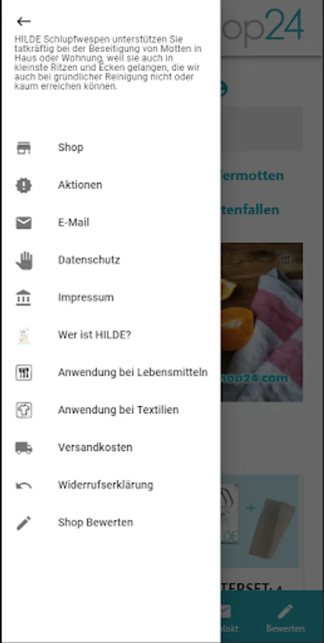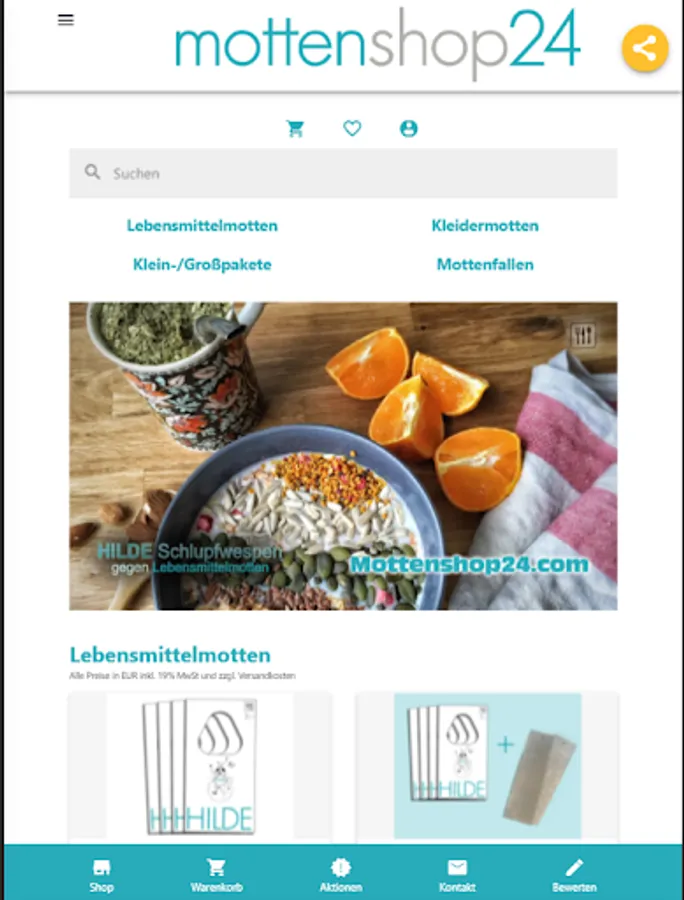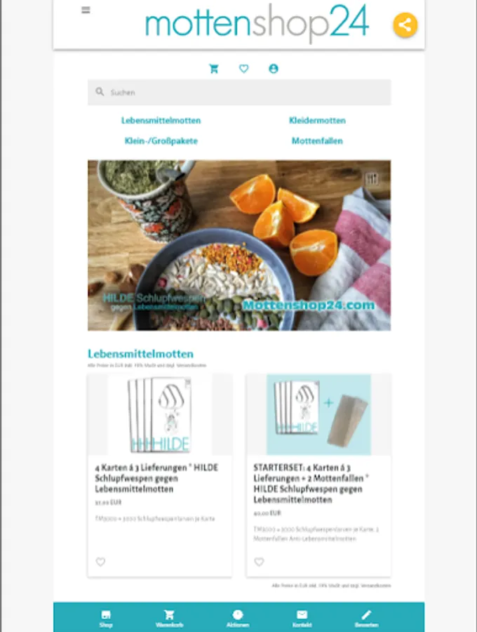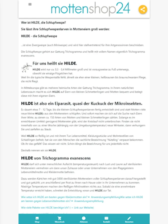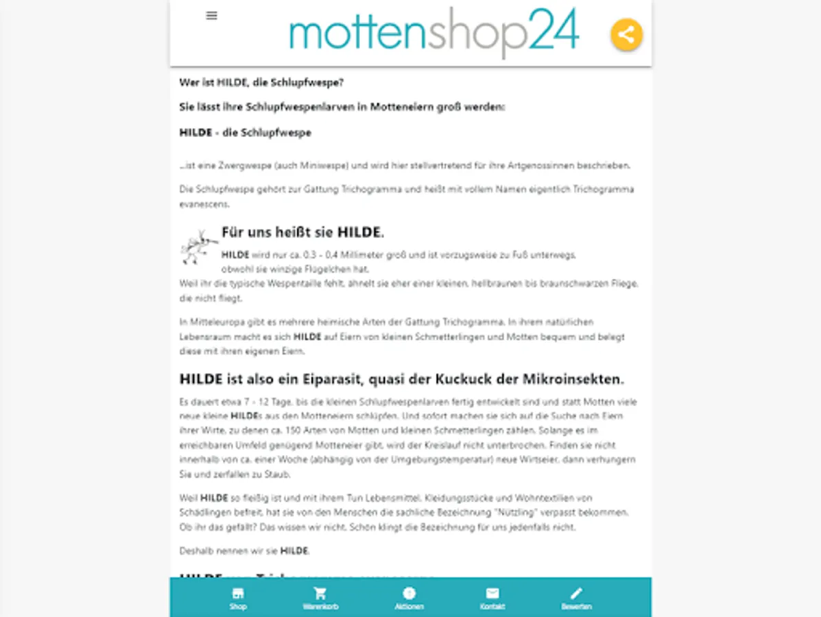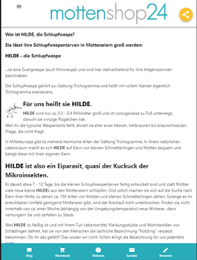 In this app you will not only find HILDE parasitic wasps for your needs, but also useful information about food moths and clothes moths as well as the use of HILDE parasitic wasps against moths. You will receive information about offers and current reports by push message.