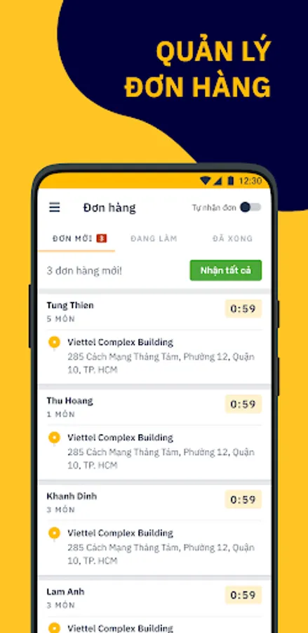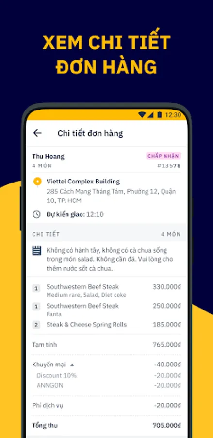 - Order management: Receive/reject orders, prepare orders and track order status.