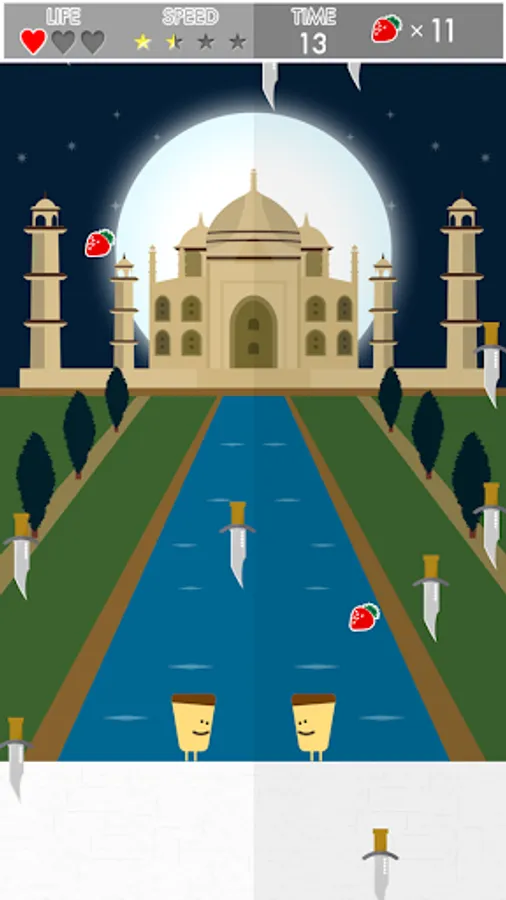 There are a lot of knifes in the strange world.You can avoid knifes by holding the screen.If your character collides with a knife, the game is over.