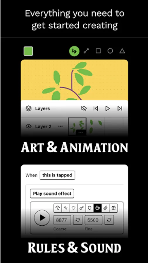 Anyone can create cards in the Castle editor. Get started with just a doodle in our simple yet robust drawing tool, which includes shapes, layers, and even frame animation. Then bring your drawing to life with motion, physics, behaviors, rules, and sound effects.
