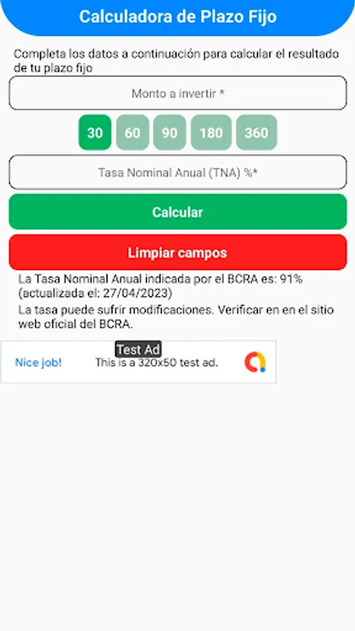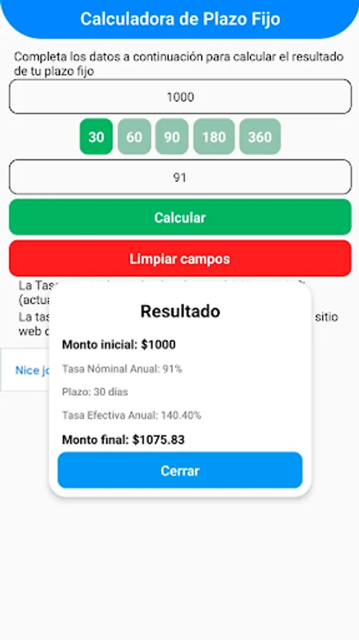 Fixed Term Calculator is an application that allows you to calculate the money you will receive after depositing an amount in a fixed term.
