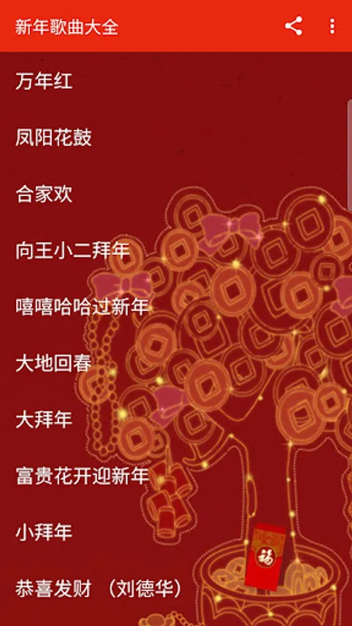 新年歌曲大全是你在这佳节里,少不了的音乐APP。新年歌曲大全收录了多首耳熟能详的经典新年歌。在这欢乐的佳节里,大家一起唱唱新年歌,齐齐过个快乐年吧!