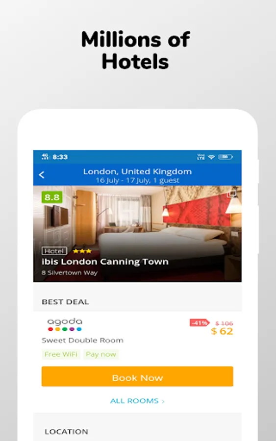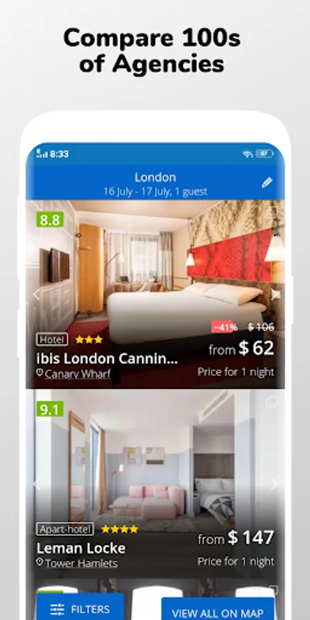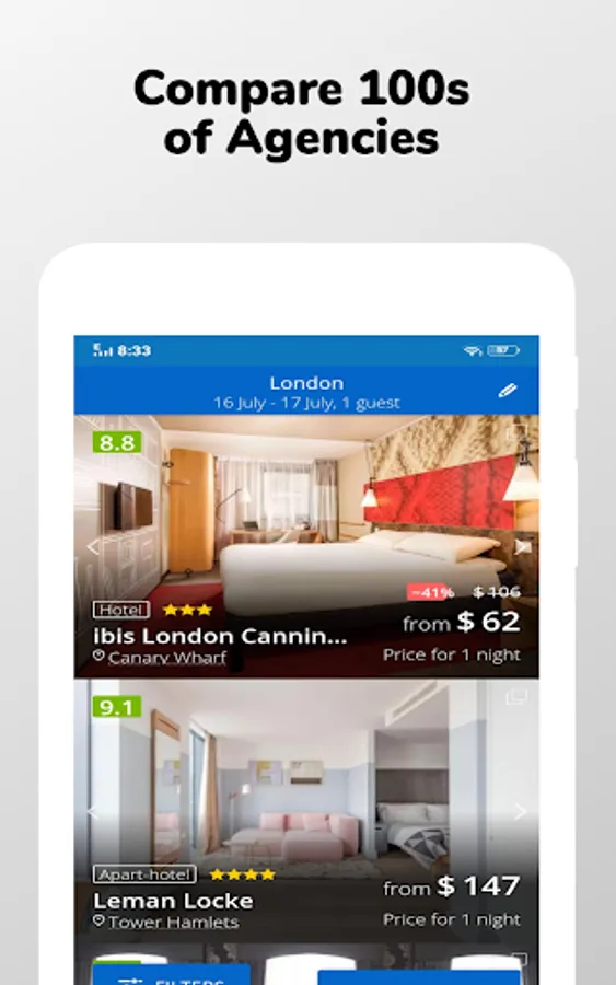 Plan a trip with a discount hotel travel app to make your travel more comfortable and easy. You can find hotel stay app in any category like hotels and motels, villa, apartments, luxury escapes, weekly hotels, vacation rentals etc. Budget hotel booking app makes your travel budget-friendly with the best discount and deals even for your last minute hotel booking. Choice Hotels, Westin, Hilton, Best Western, IHG, La Quinta, Marriott, Accor, Hyatt, Preferred, Premier Inn, Radisson, Travelodge hotels and motels, Hotel tonight, Ramada, Shangri-la, Sheraton, Six senses, My6(motel6), Four Seasons, Bellagio, Holiday Inn, Ritz Carlton, are acquainted in this best hotel finder app.