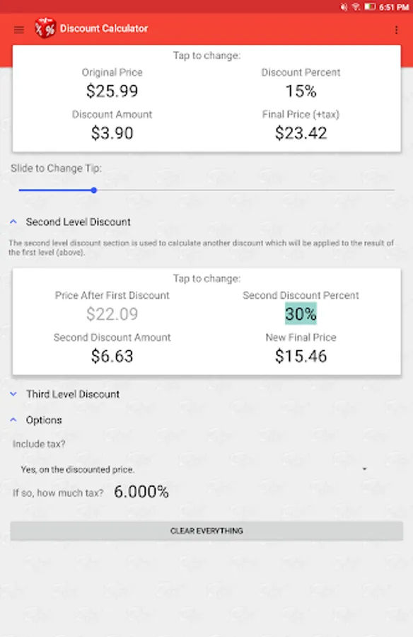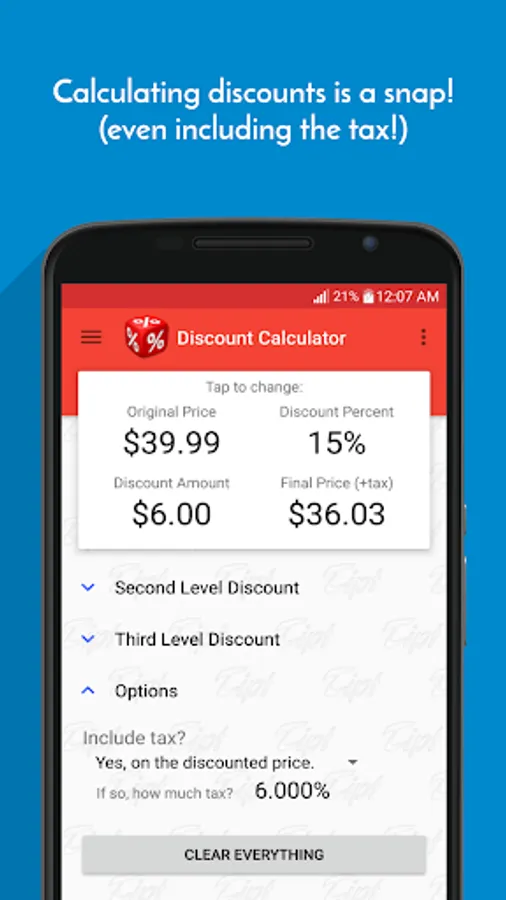 Tipt allows you to calculate tips and discounts with ease. No more struggling with complicated math with percentages and decimals. Tipt will handle it for you.