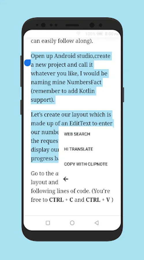 It's easy, just select text from anywhere then click on *Copy with ClipNote* and that's it... The selected text would be copied and also saved to the Clip Note app.