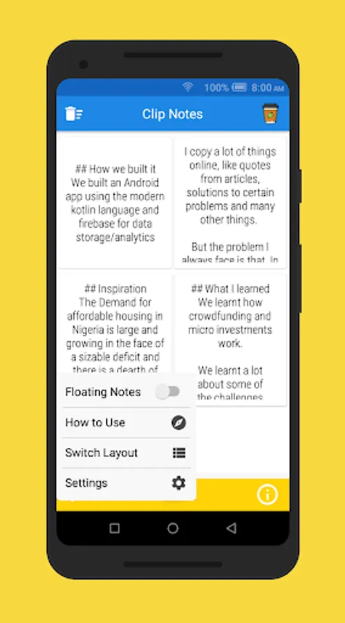 * With the new Floating notes, note taking has never been easier. Now you can carry your notes with you anywhere on your phone.