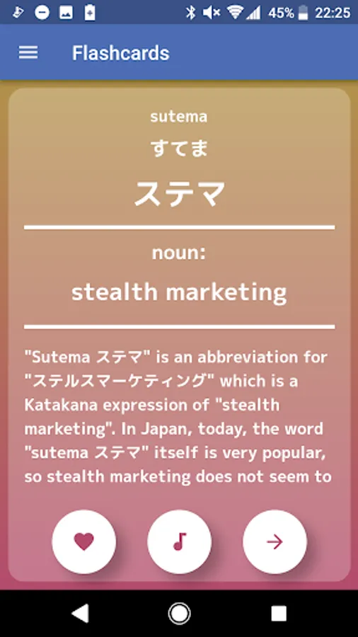 When you learn vocabulary through flashcards, you can use a favorite button to add words on the Favorite words list. Once you add words on the list, you can relearn what you've learned independently of a date stored on the Record Mode.