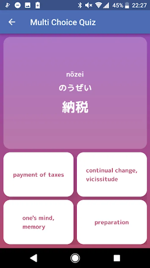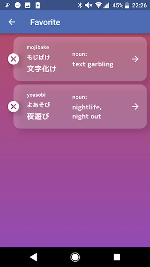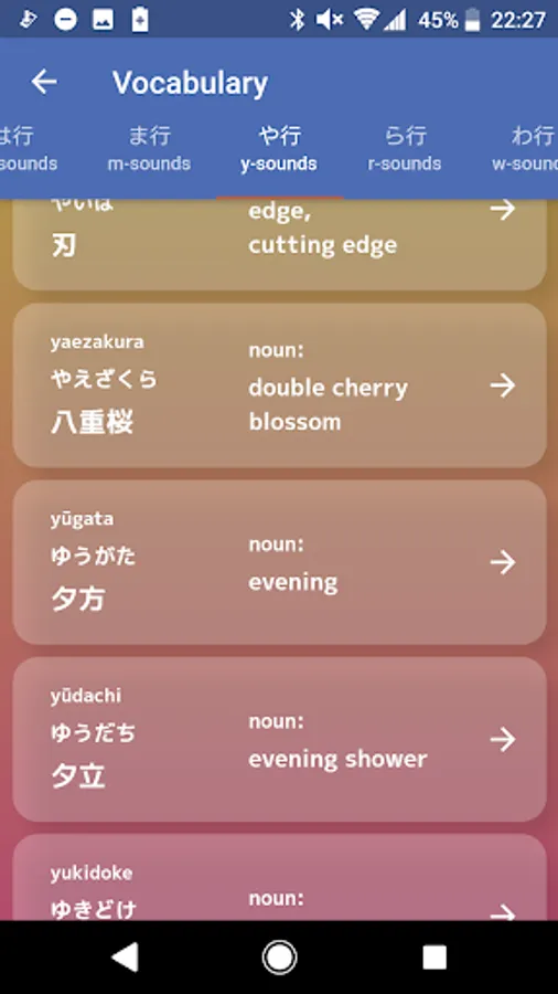Flashcards would be helpful to improve your Japanese vocabulary. 308 words are contained on the app with their sound files. These words are a bit weird and different from those on other apps. One of targets is to help Japanese learners to feel a piece of Japanese culture through vocabulary. You can check meanings, constructions and pronunciations of vocabulary without connection to the internet.