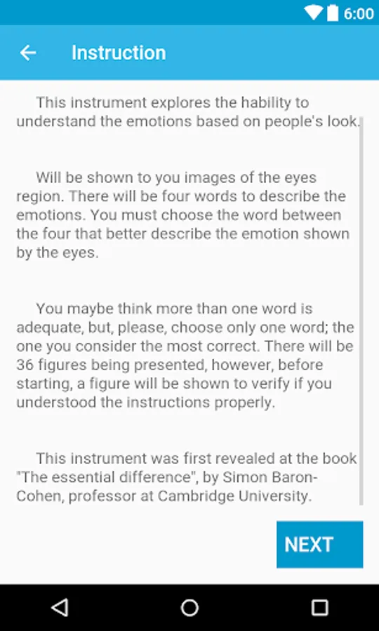 This application has as objective to implement the experiment explore in "Revised Reading the Mind in the Eyes Test (RMET)-Brazilian version" paper, published at "Revista Brasileira de Psiquiatria" (Brazilian Magazine of Psychiatry), 2001. Brazil.