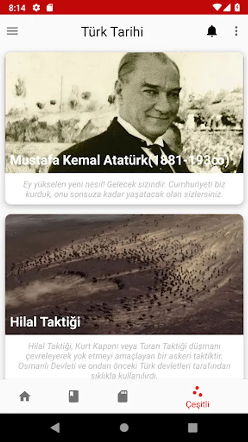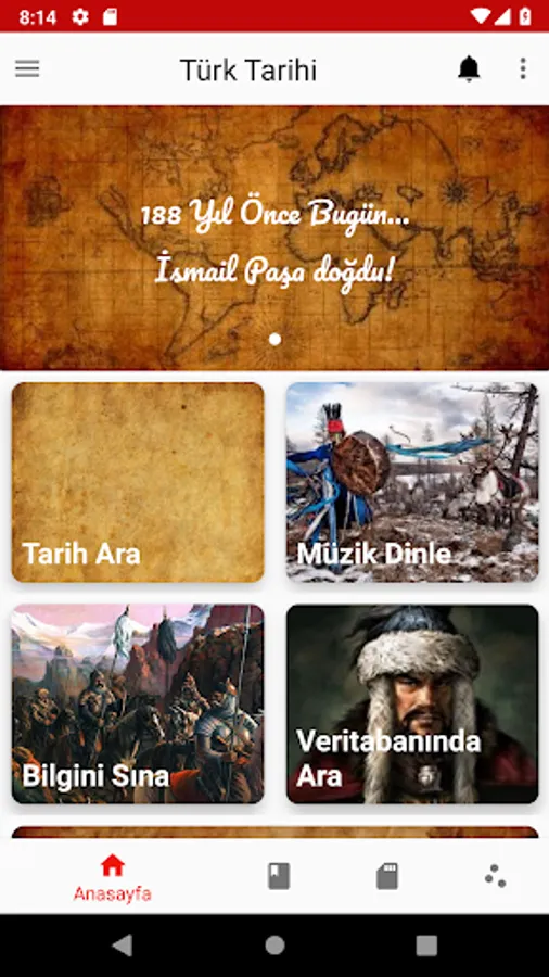On the main screen of the application, if a significant event occurred on that day in Turkish history, the date card of the day will appear. In addition, if the user wishes, he / she will be able to receive notifications about this subject. (You can get notifications on more topics)