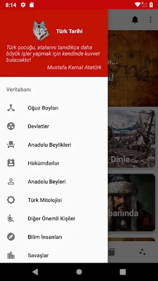 In this application, you will find 118 Turkish States, 1269 Turkish rulers, 33 Anatolian principals, 201 Turkish bey, 75 treaties, 179 wars, 21 inscriptions, dictionaries consisting of thousands of words, 100 historical works, 282 proverbs and much more.