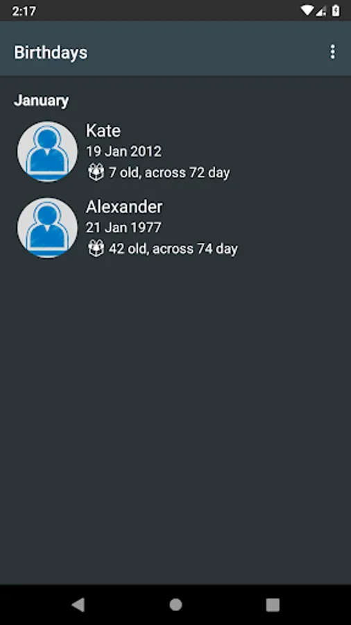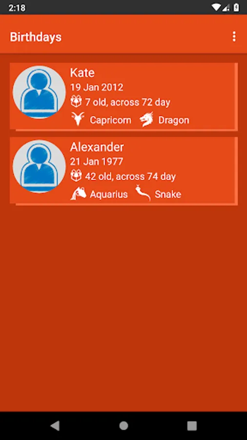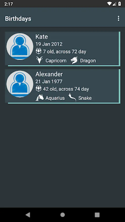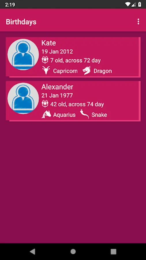 Shows birthdays and anniversaries from your contacts book. Builds a psychomatrix square of Pythagoras. View daily horoscope. Send Birthday Messages and Birthday Wishes from template