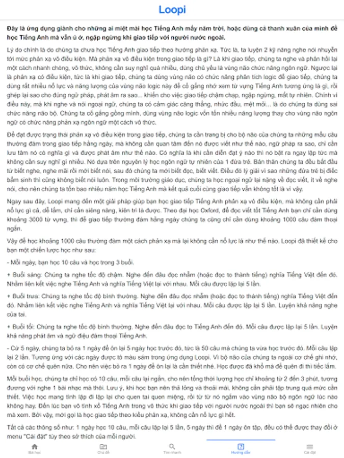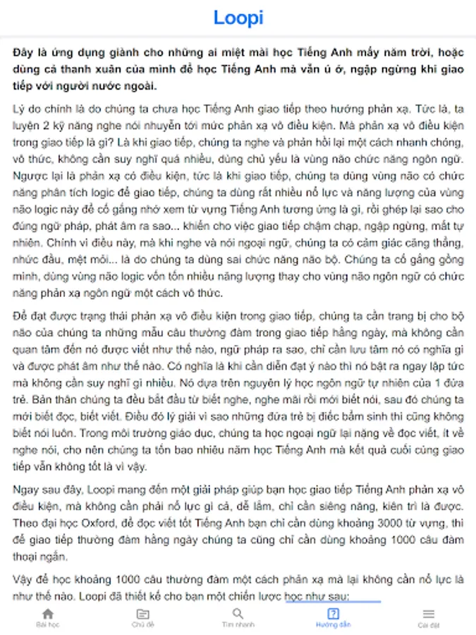 Loopi brings a solution to help you learn to communicate in English reflexively unconditionally, without any effort, very easy, just need to be diligent and persistent. According to Oxford University, in order to read and write English well, you only need to use about 3000 words, then for everyday conversation we only need to use about 1000 short conversational sentences.