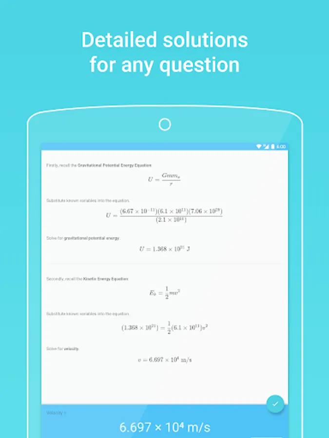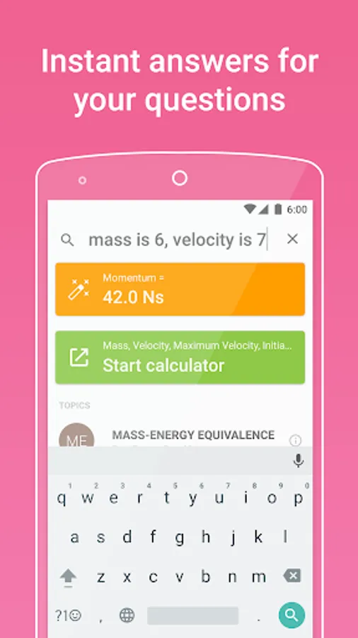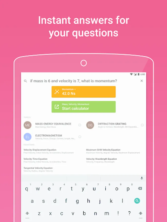 Get step by step solutions for questions in over 30 physics topics like Kinematics, Forces, Gravity, Quantum Physics and many more. Ask PhyWiz a question like "if mass is 6 and velocity is 7, what is momentum?" and get your answer immediately.