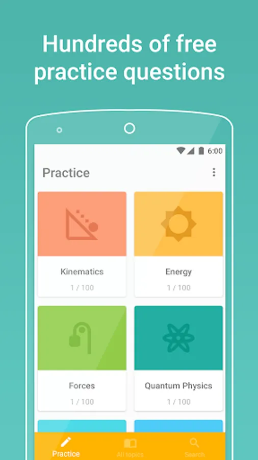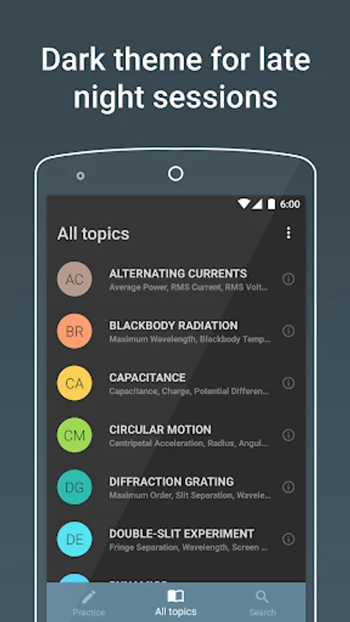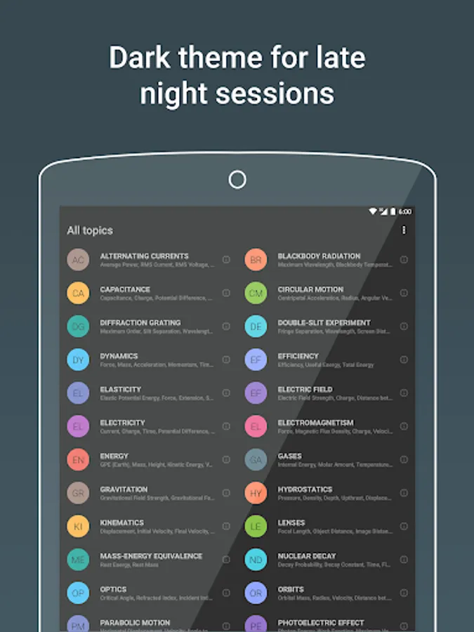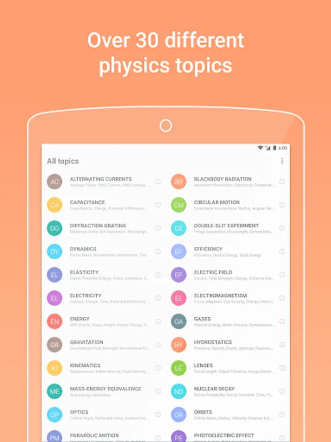The supported topics in this version are: Alternating Currents, Blackbody Radiation, Capacitance, Circular Motion, Diffraction Grating, Double-Slit Experiment, Dynamics, Efficiency, Elasticity, Electric Field, Electricity, Electromagnetism, Energy, Friction, Gases, Gravitation, Hydrostatics, Kinematics, Lenses, Mass-Energy Equivalence, Nuclear Decay, Optics, Orbits, Parabolic Motion, Photoelectric Effect, Power, Quantum Physics, Quantum Tunelling, Relativity, Simple Harmonic Motion, Thermal Physics, Transformers, Uncertainty Principle, Vectors, Waves.