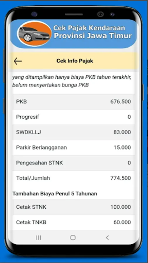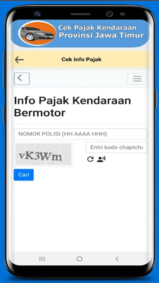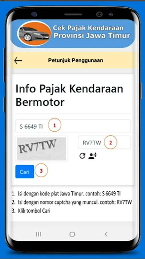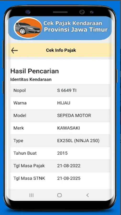 Disclaimer: This online application contains informative checks for motorized vehicle tax license numbers sourced from the Bapenda e-Samsat website for East Java province https://info.dipendajatim.go.id and does not represent a government entity.