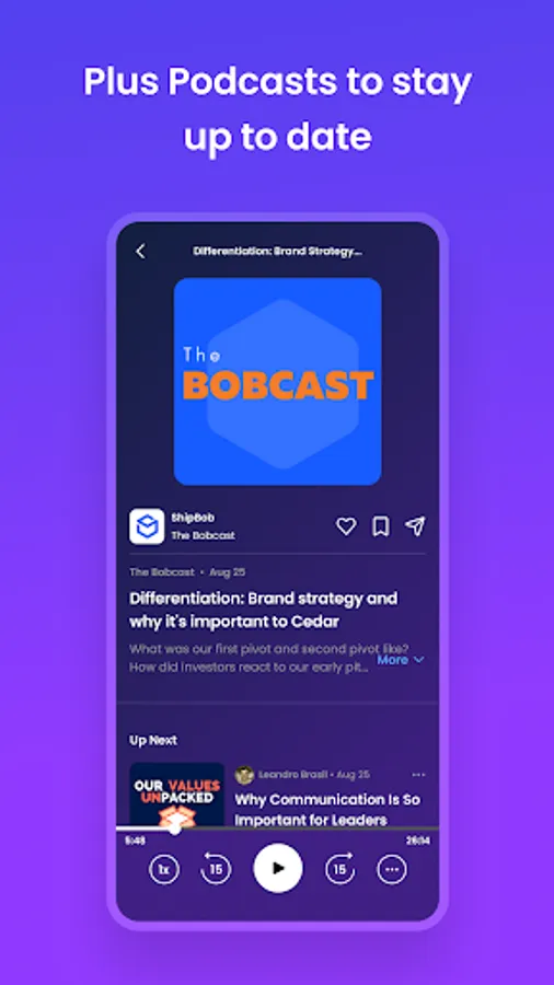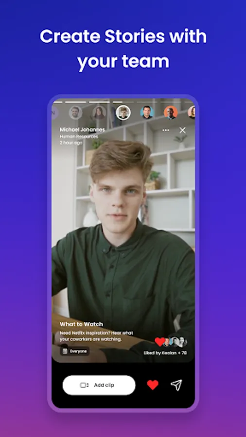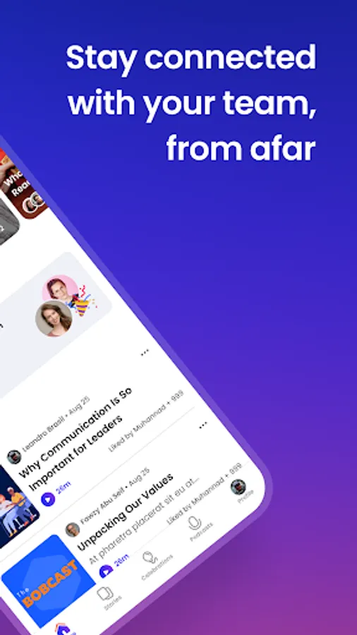 Tune into Stories from across your company, or create your own Story together with your team. Record short video or audio clips to celebrate big wins, welcome a new hire, swap vacation memories, share movie recommendations, and more. It's like the Instagram Stories you love – but with a mix of voices from around your team. Plus, you can tune into podcasts from leaders for the updates and insights you need to succeed.
