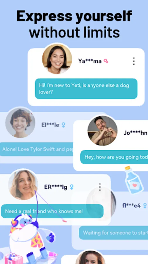Yeti is the warmest space for you to chat & make new friends! Swipe though tons of profiles or Catch random messages to discover new friendships and chat with your new besties with ease here on Yeti!