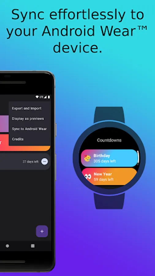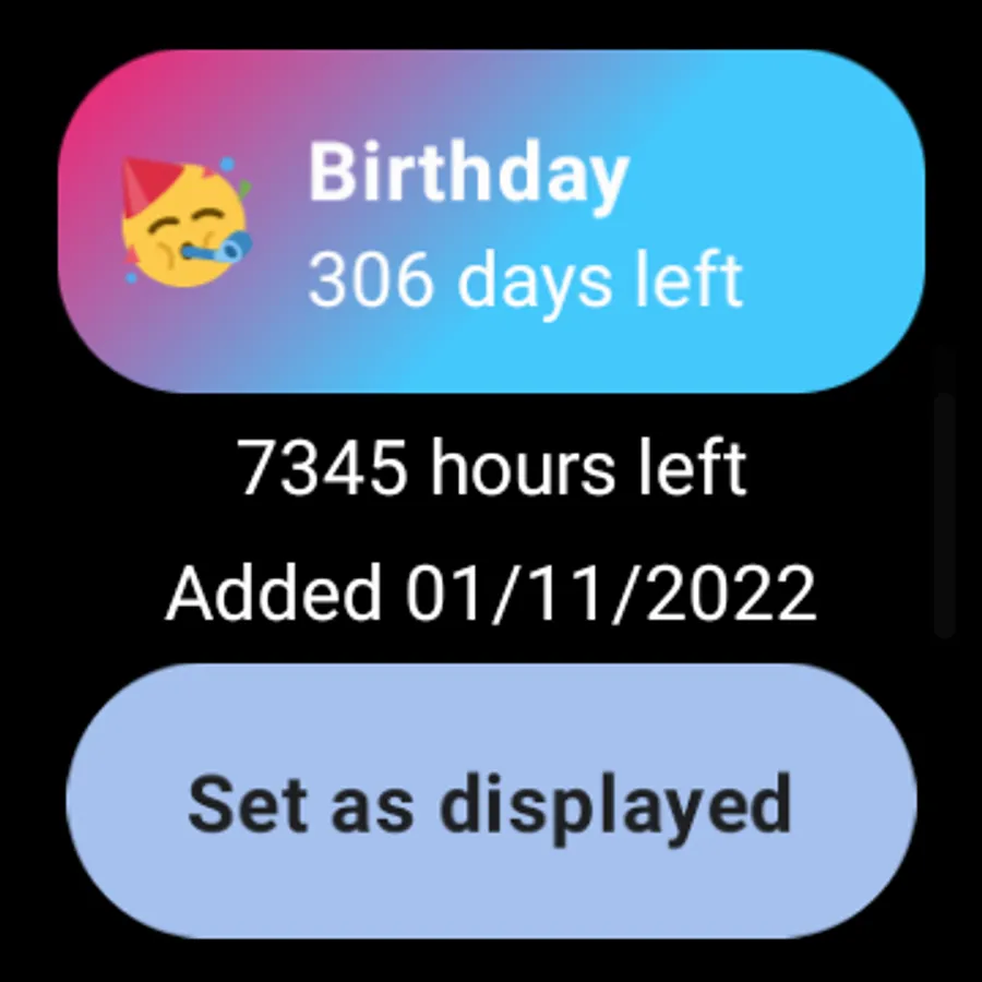 Additionally, you can carry around your Countdowns right on your wrist, with Android Wear. Display your countdowns in tiles, complications and in App on your watch.