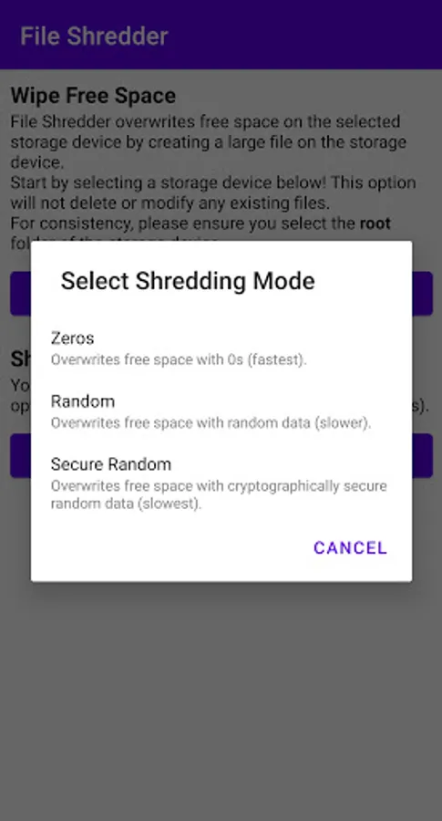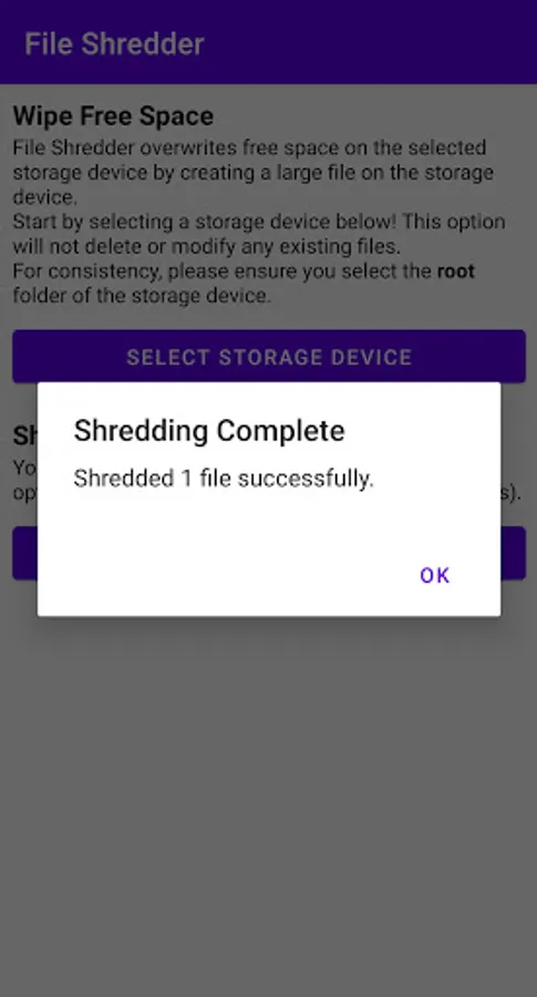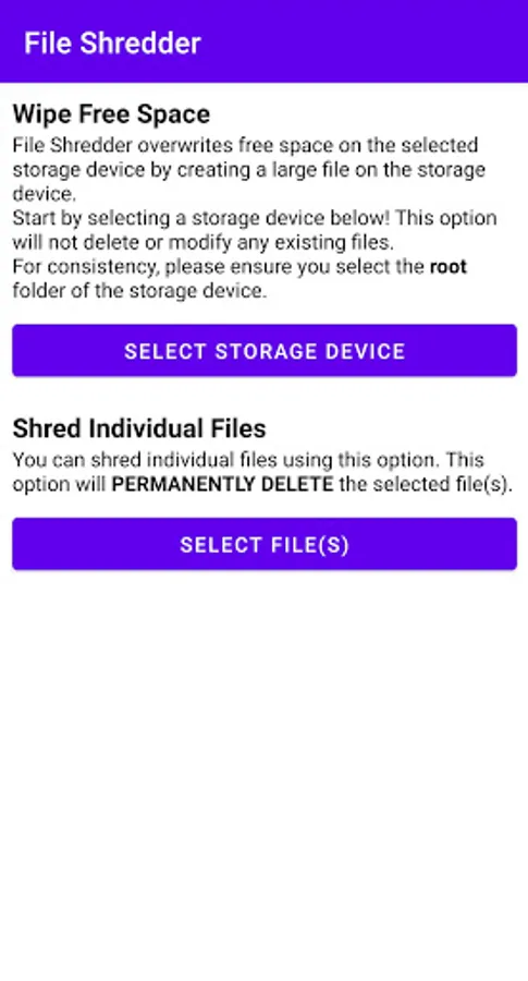 File Shredder is a simple, handy app that makes deleted files on your internal storage unrecoverable by overwriting all available space with zeros or random data (see modes below). This means recoverable data from deleted files such as images, videos, databases, is replaced with useless bytes.