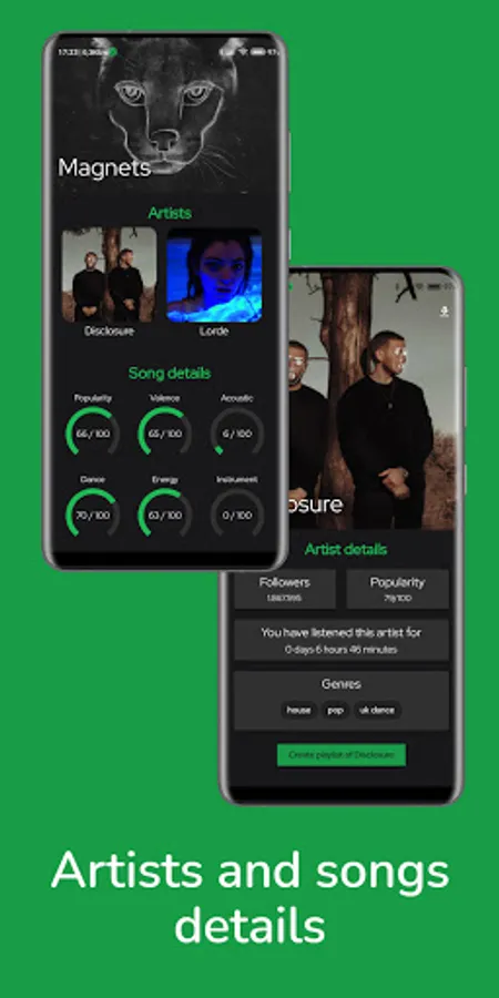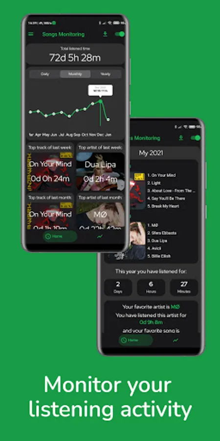 Is also available a feature called Song Monitoring which lets you monitor how long you listen to a specific artist or song with the precision of milliseconds. To do this you need to let run SpotifyTools in the background. I could have done other solutions but this is the one the let me monitor precisely your listening activity. SpotifyTools is also optimized to not do heavy work in the background to be battery friendly.