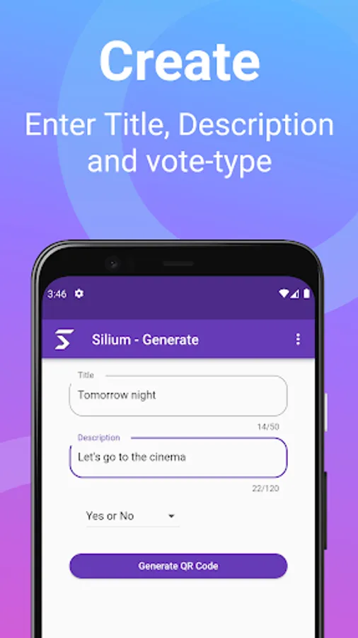 To create a poll, enter a title and a description and click "Generate QR Code".