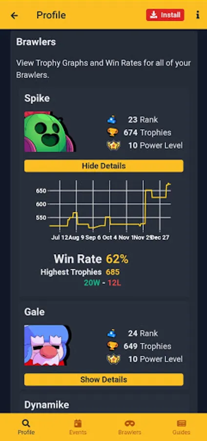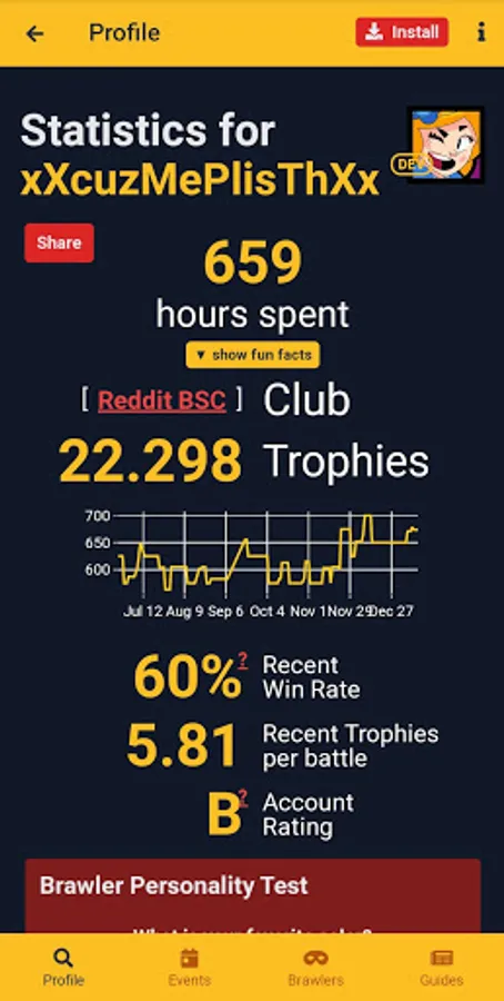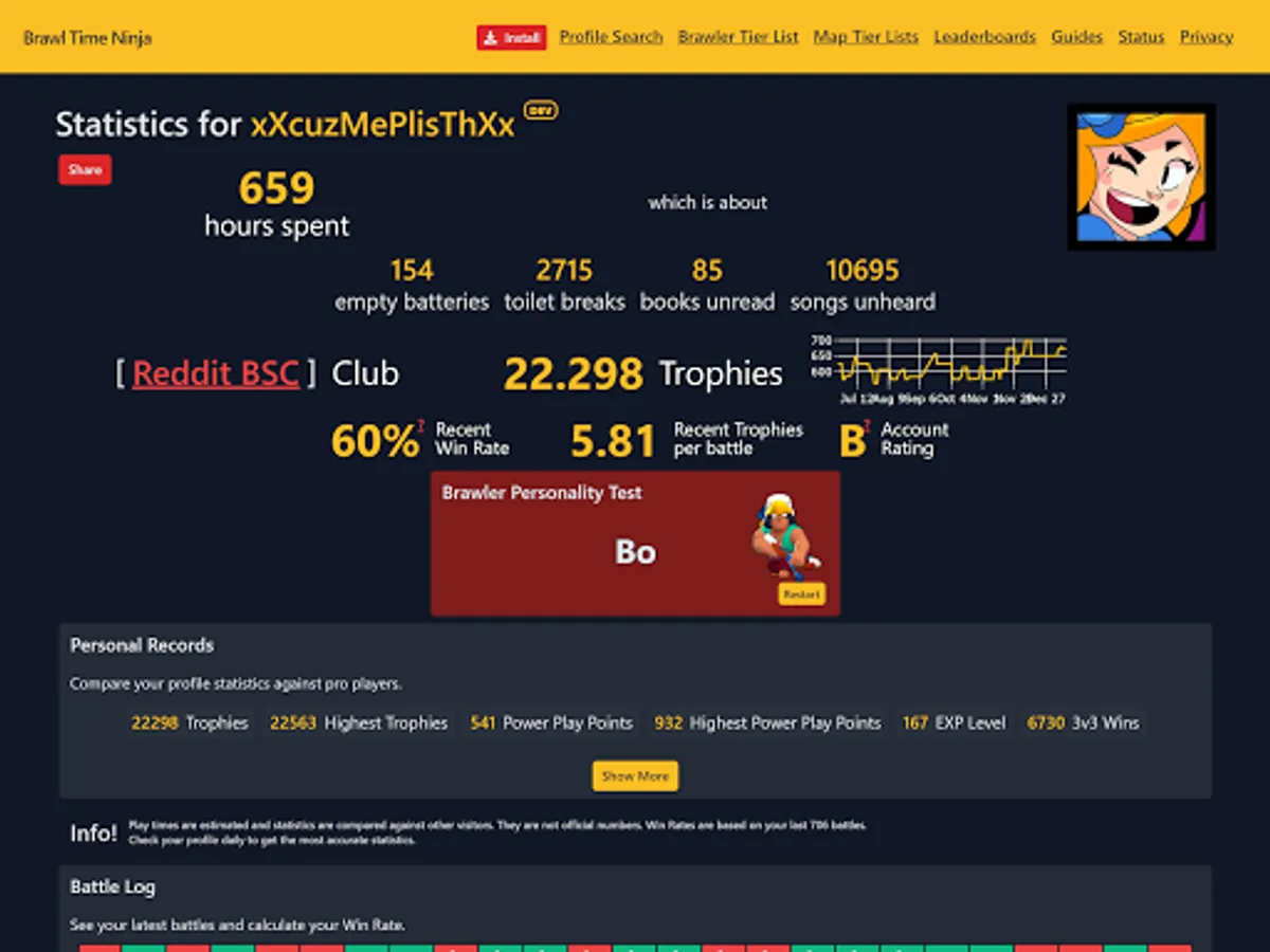 Brawl Time Ninja is a stats app to track your Trophies. Record your progress and improve your ranking.