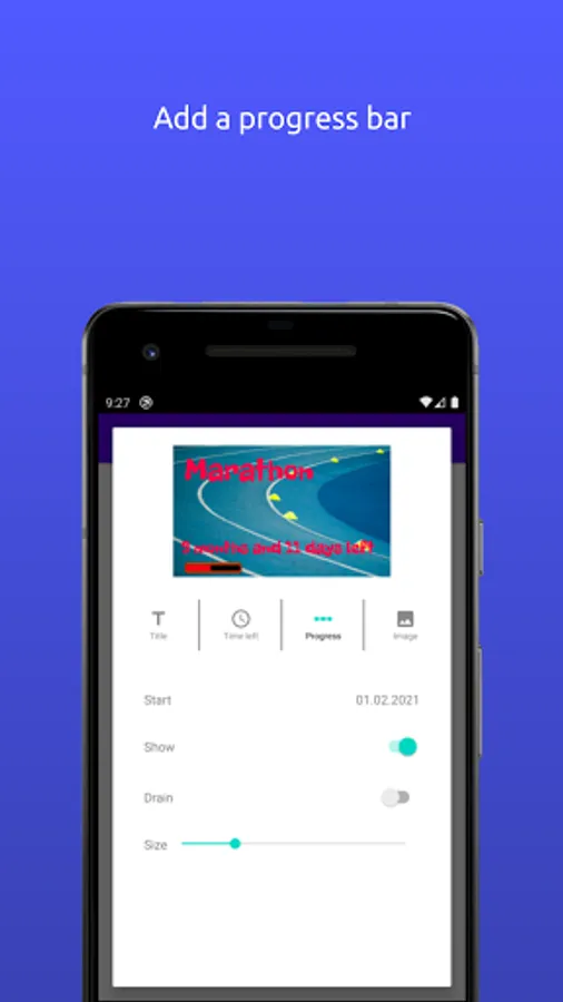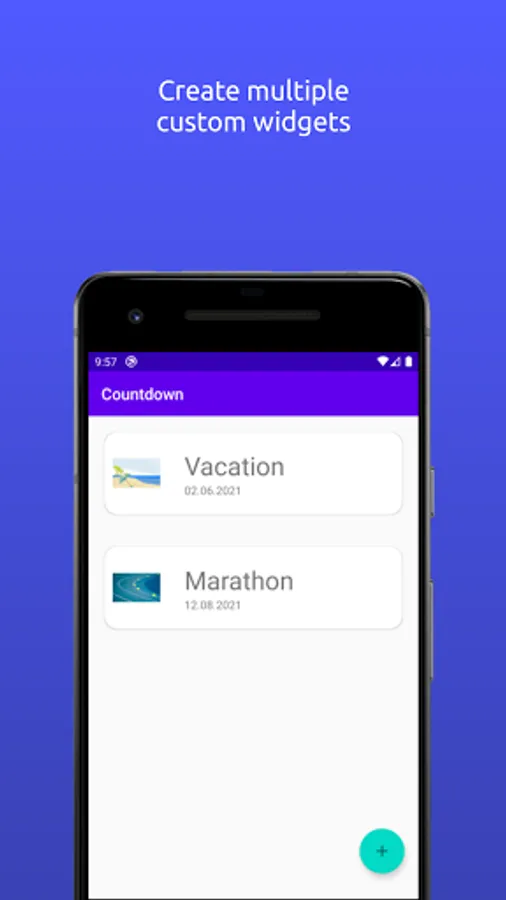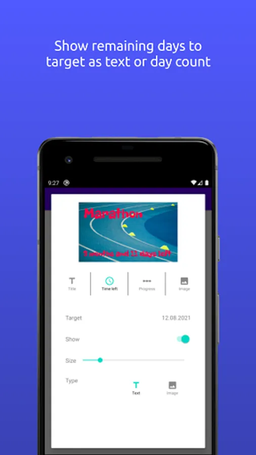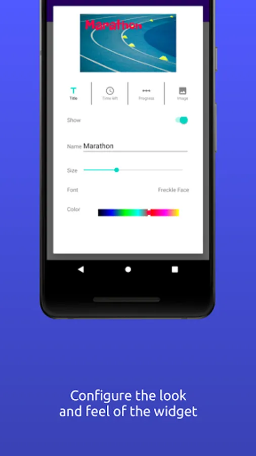 Create and customize widgets to display on the home screen. Use your own images or pick from a list of illustrations to use as the background. Pick the font to use and placement of text and counter to display. You can also add a progress bar when there is a start date for the countdown. The Widgets can flip through multiple countdowns.
