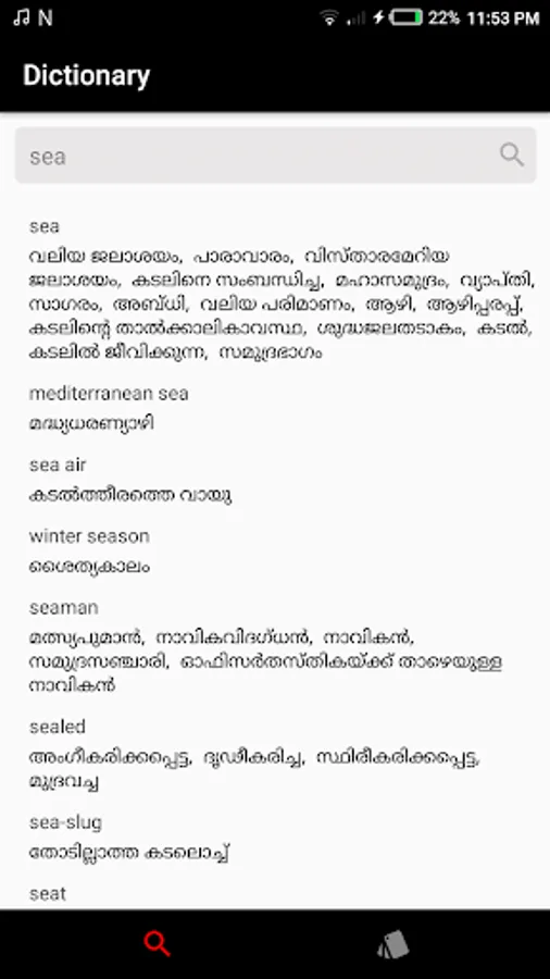 Our new English to Malayalam Dictionary app is a light weight and elegant tool. You can find over 2 lac english words with their Malayalam meanings for Free on your smartphone! You can easily search for any word you want and we will take care of giving the meaning of it and the best thing is that you can take quiz to test your knowledge in this Indo-Aryan language.